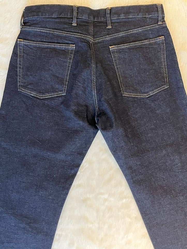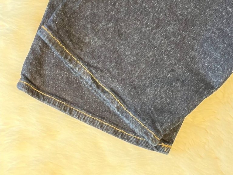 Straight cut, vintage indigo blue, stitched finish to leg
