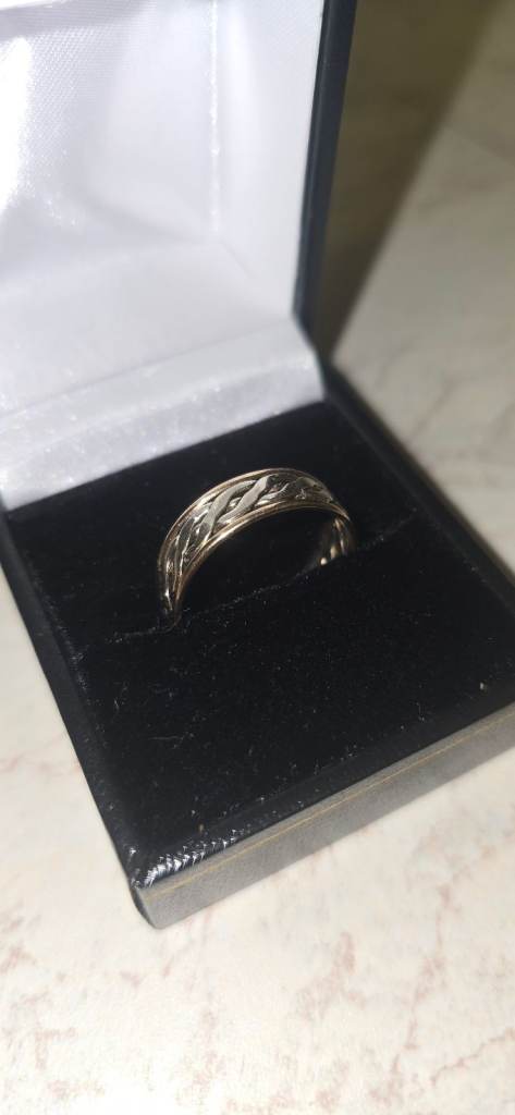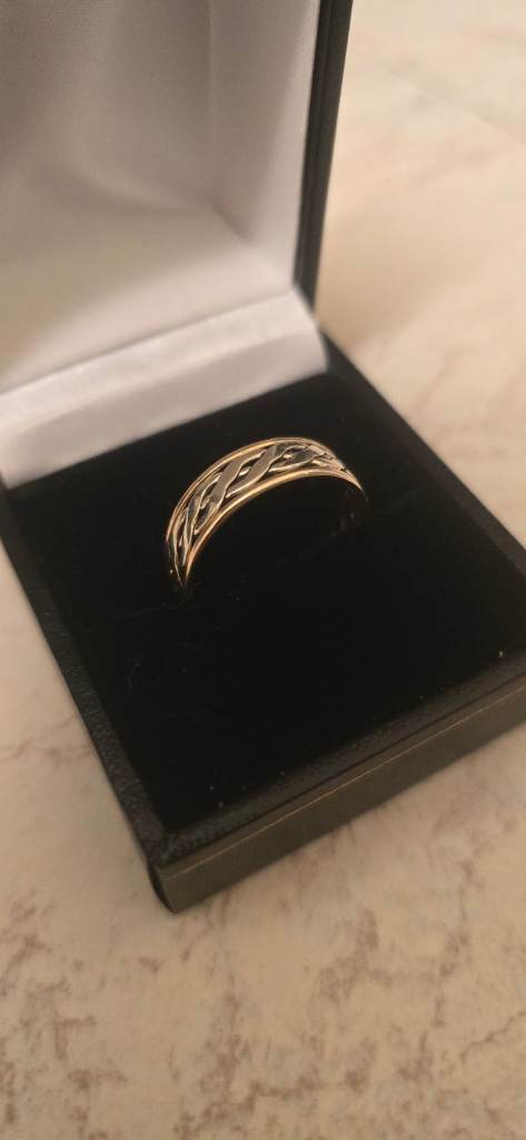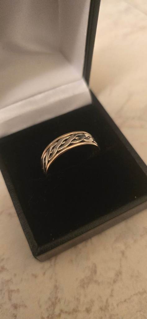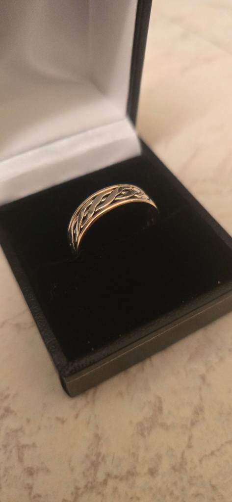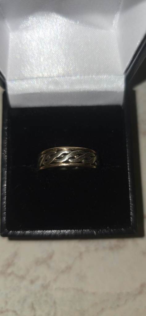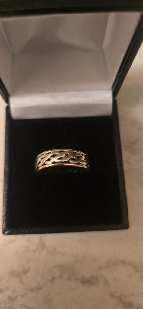 9ct yellow and white gold wedding band, I wore this casually though as I like the celtic designs. Great condition, stamped 375, and weighs in at 3.23g. The ring is a size R, would either take a cash sale or would be happy to swap for something of the same value and slighter bigger size as this is a bit tight fitting on me, any questions please ask!
