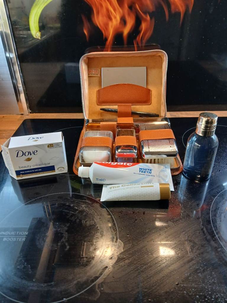 Men's Grooming Set Vintage in Leather ideal gift for him Made in England by Two-Tix contains Chrome Accessory's Hair Brush - Nail Brush - Soap Dish with Dove Soap - Tooth Brush -Combe - Nail File - Mirror all in Russet Leather Case also included Tooth Paste - Body Wash - Shampoo all for £ 16 collect from Kings Norton B30 3AS