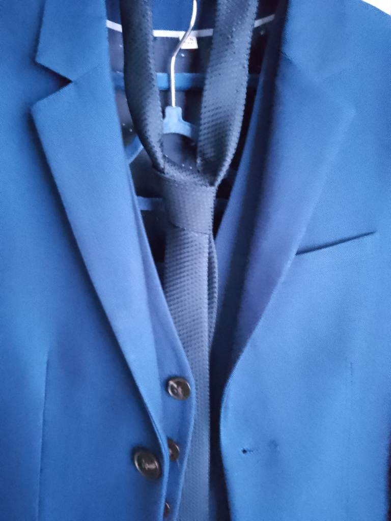 Smart boys blue three-piece suit, includes the jacket, waistcoat, and trousers. Also a tie.