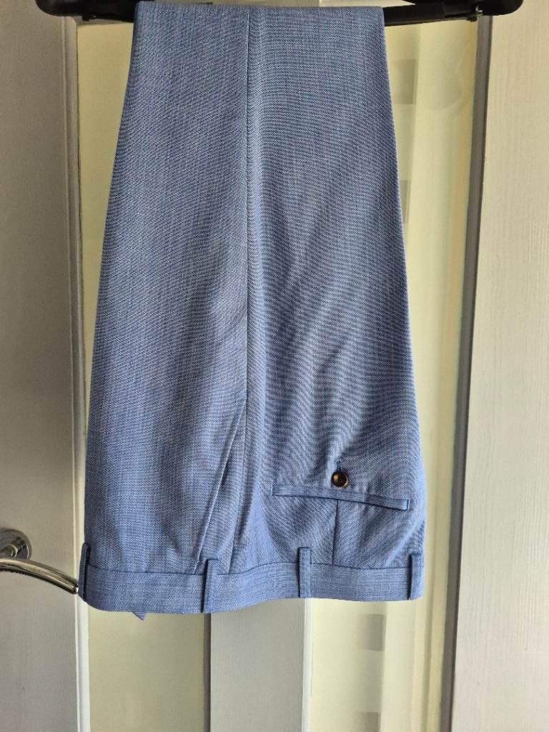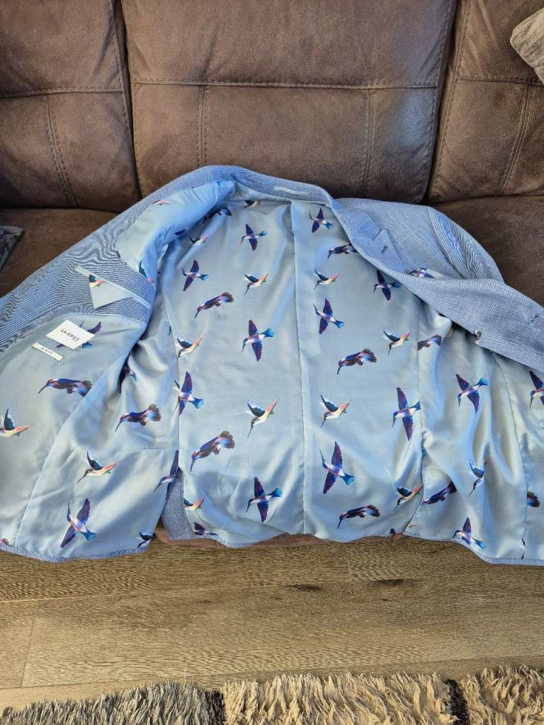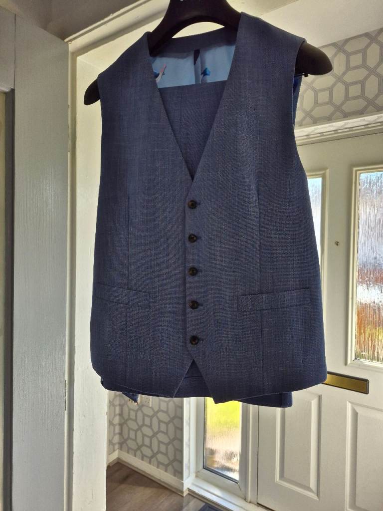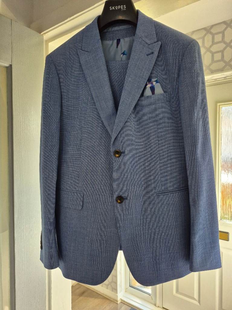 Lovely light blue mans suit , bought from skopes in August, worn once . Jacket is slimfit size 42R, waistcoat is 42R ,trousers are tapered fit 36S . All lined , excellant condition £20 no offers .