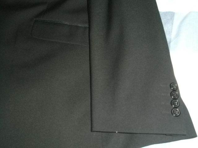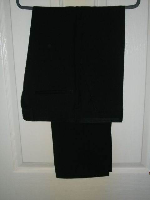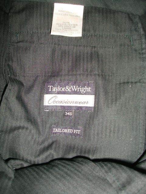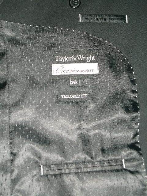 Taylor Wright black tailored-fit suit in superb, as-new condition. Single breasted 38" regular fit jacket with single rear vent and refined lapel detailing. Equally impressive trousers have a 34" waist with 29" inside leg. Made of 66% Polyester & 34% Viscous, with 100% Polyester inner lining.