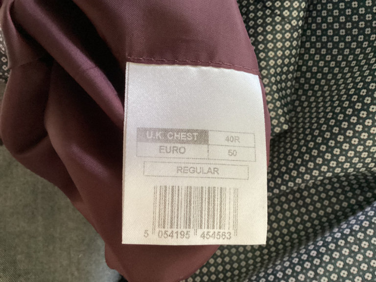 The jacket is chest size “40”. Regular.
