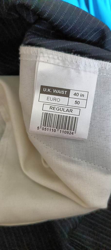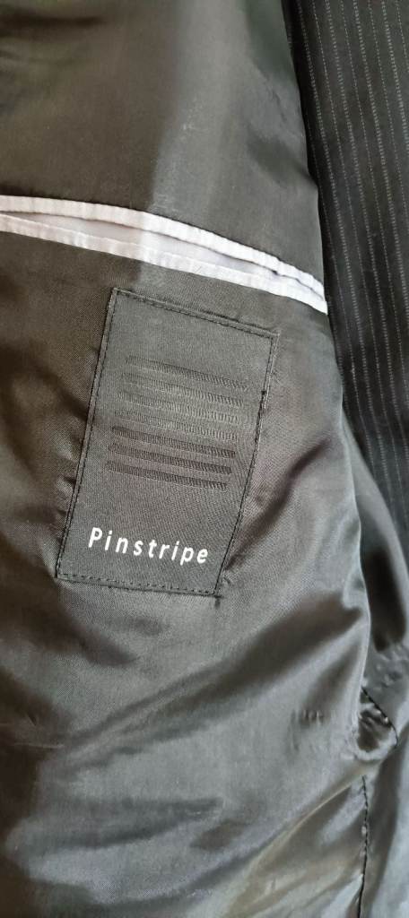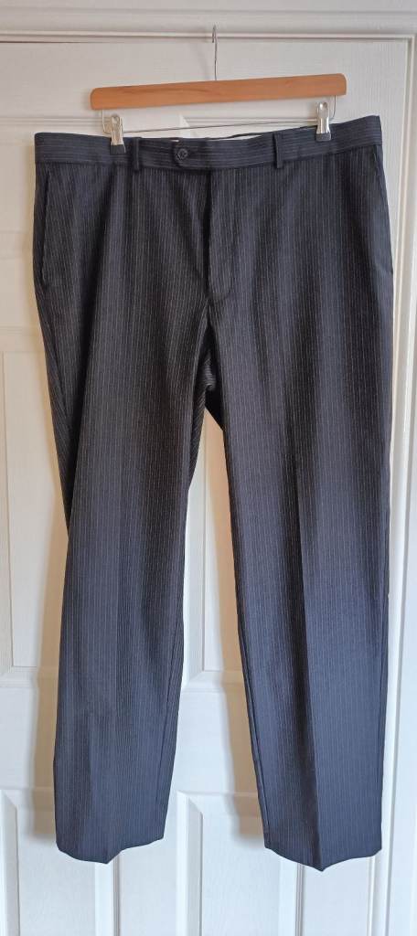 Mens pinstripe suit, worn once for a wedding but colour means it can be used for any occasion. Jacket is around a 50 regular but can be tried on to check fit. Trousers are 40 regular. Mint condition.