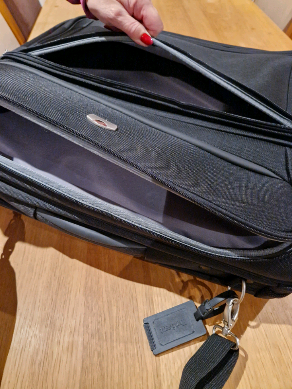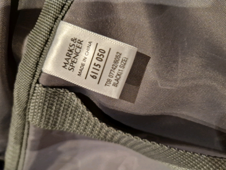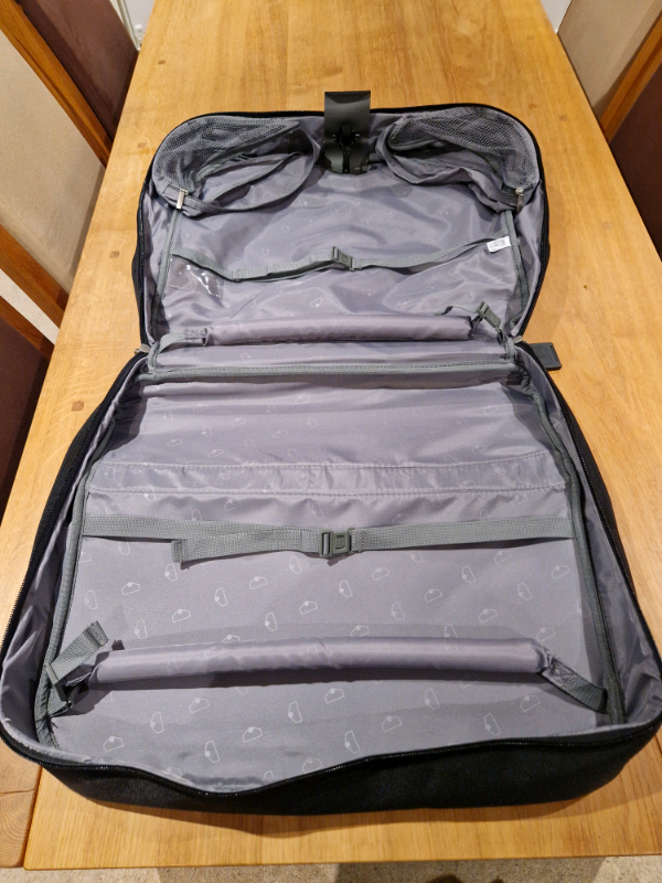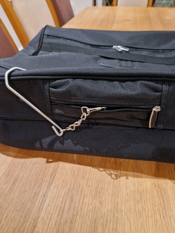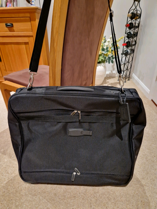 M & S multi suit bag. As new condition. Shoulder strap and handle. Multi hangar clamp. Single large pocket one side, two pockets on other side. Name tags x 2. Main compartment zip has padlock rings. Zipped compartment for strong wire hook.