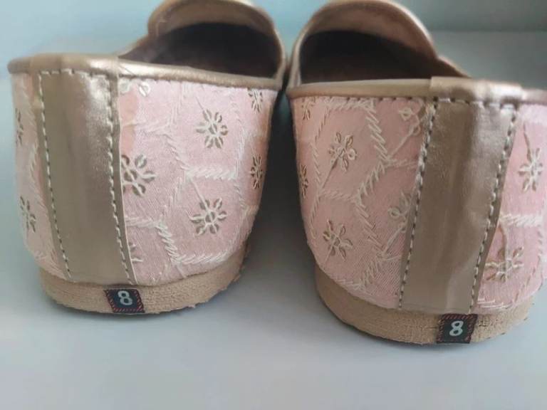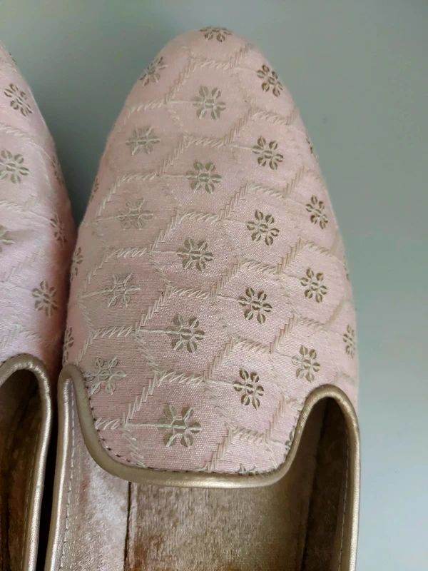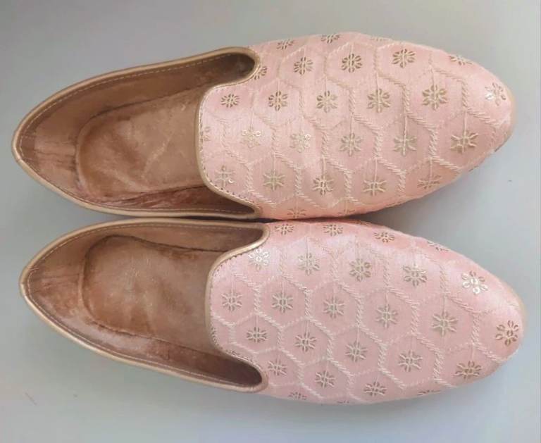 Also includes free pair of Punjabi Jutti/ Mojari size 10. This is a light pink with gold embroidered patterns.