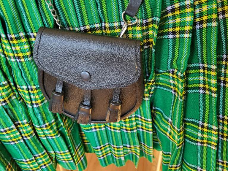 Acrylic kilt in Irish National Tartan. Worn twice and in good condition. Size 48" but will stretch a bit more. Includes a sporran with belt. Note the sporran has a slight blemish on the flap - please see photo. Sporran chain in 48" maximum Flashes for stockings included - velcro closure.