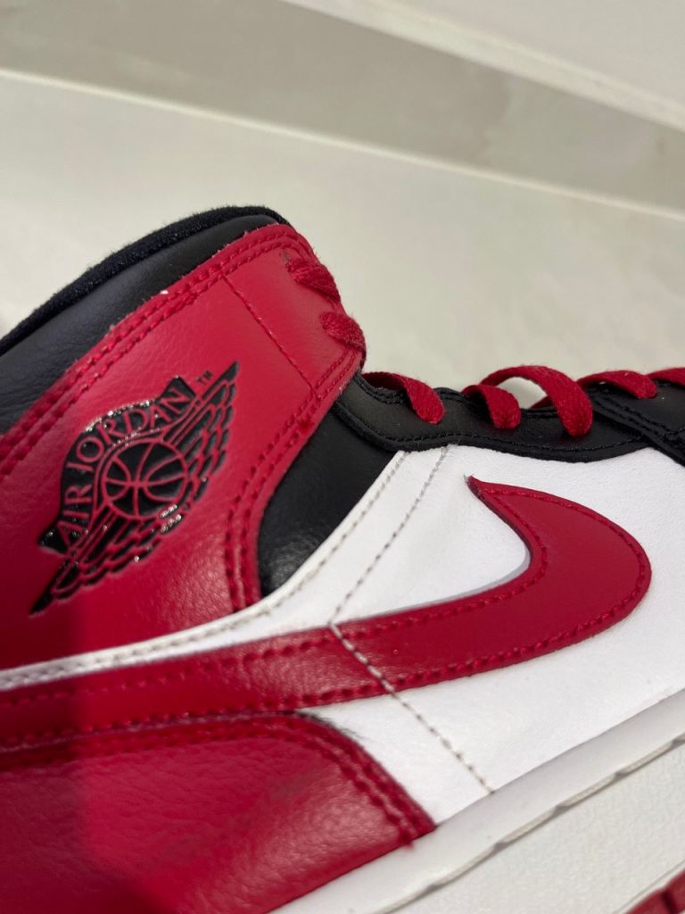 Authentic Nike Air Jordan 1 Mid trainers in the classic Chicago Black Toe colourway.