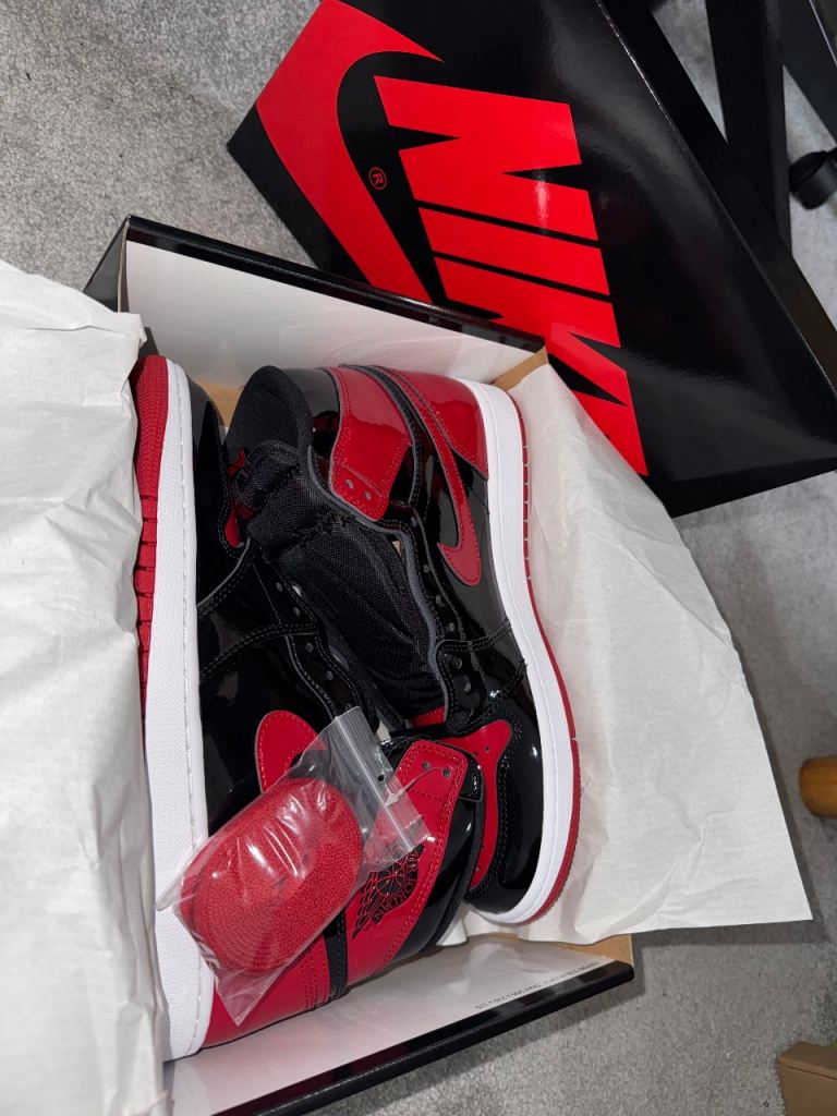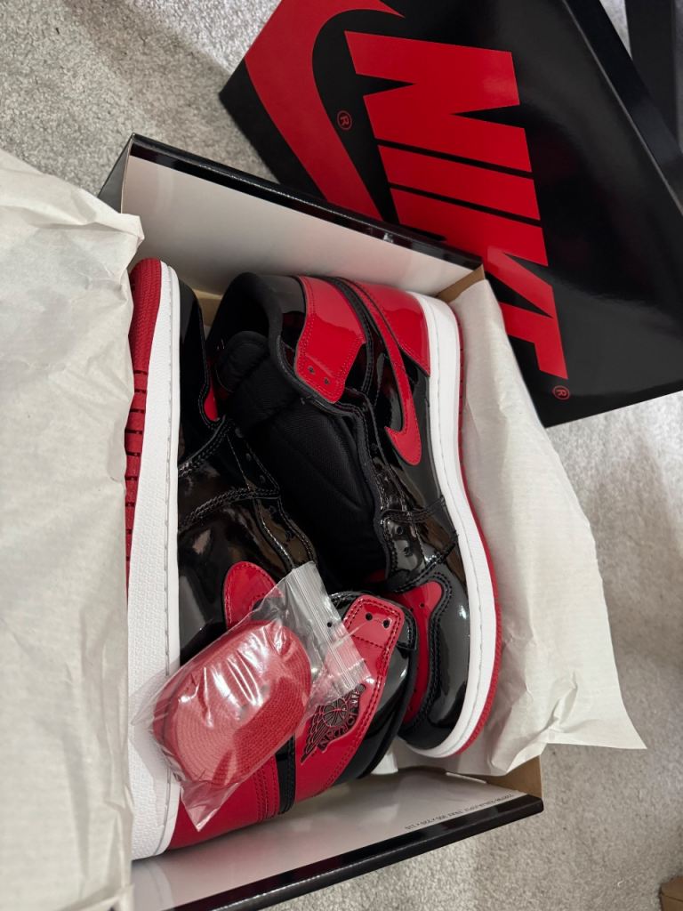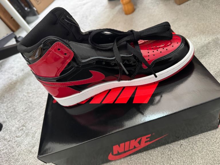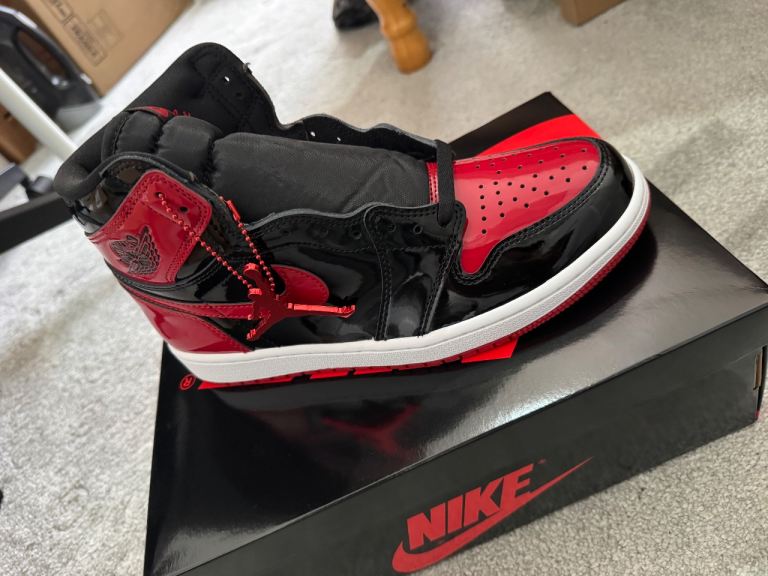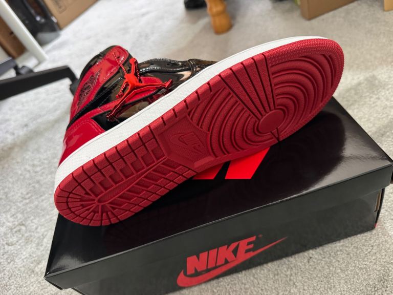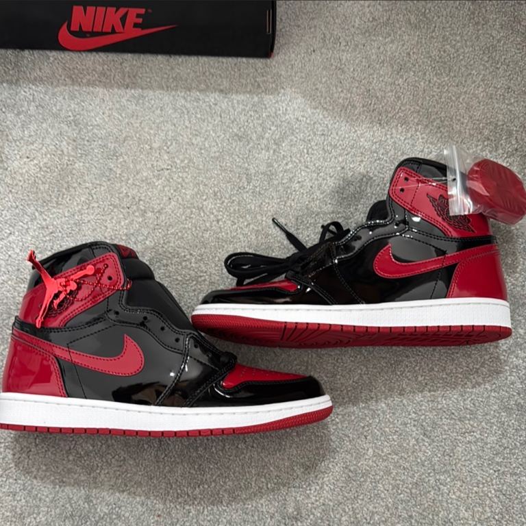 genuine pair of Air Jordan 1 Retro High OG “Patent Bred” in red/black, UK size 8.