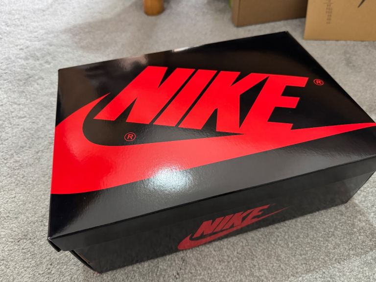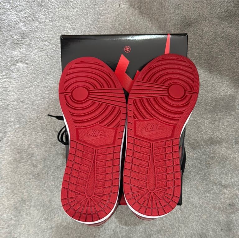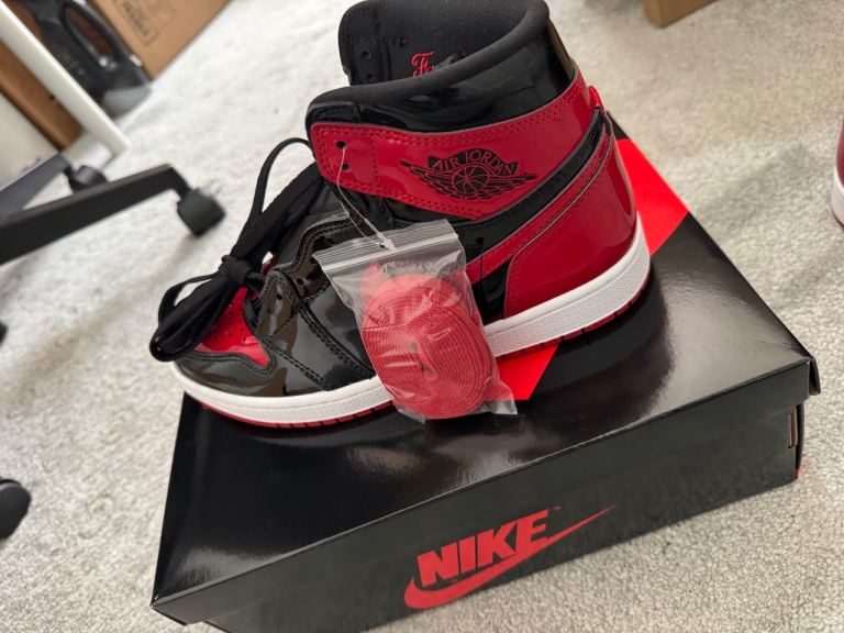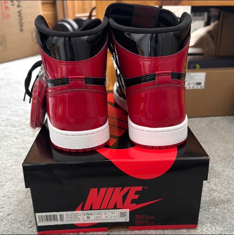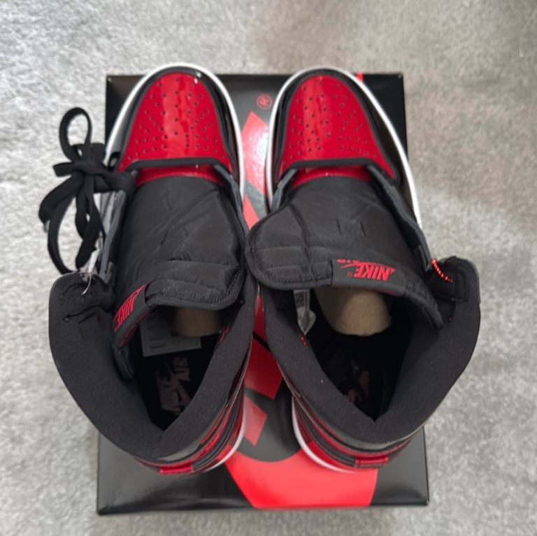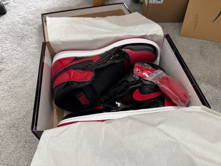 genuine pair of Air Jordan 1 Retro High OG “Patent Bred” in red/black, UK size 8.