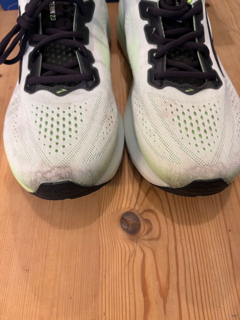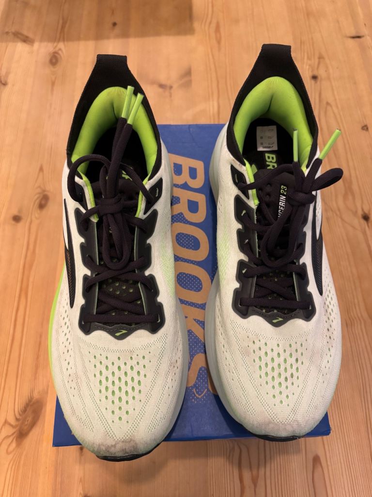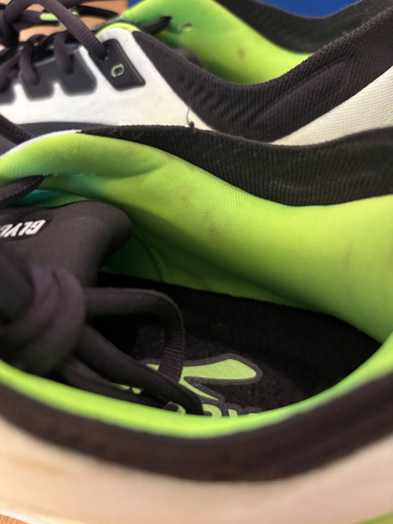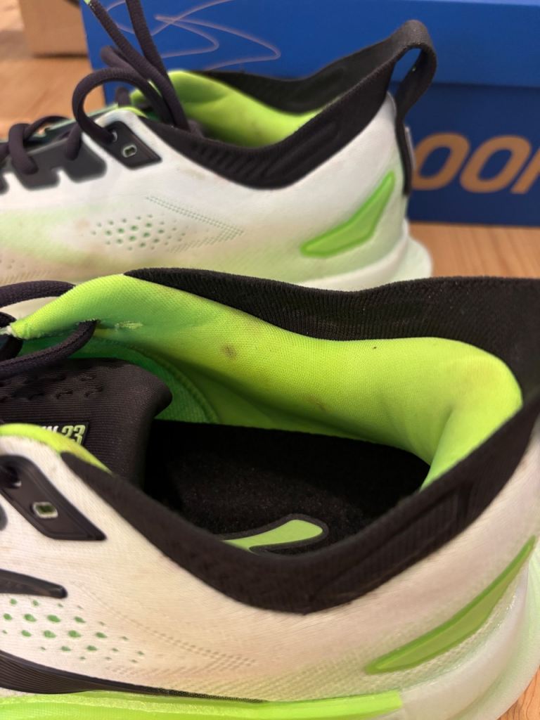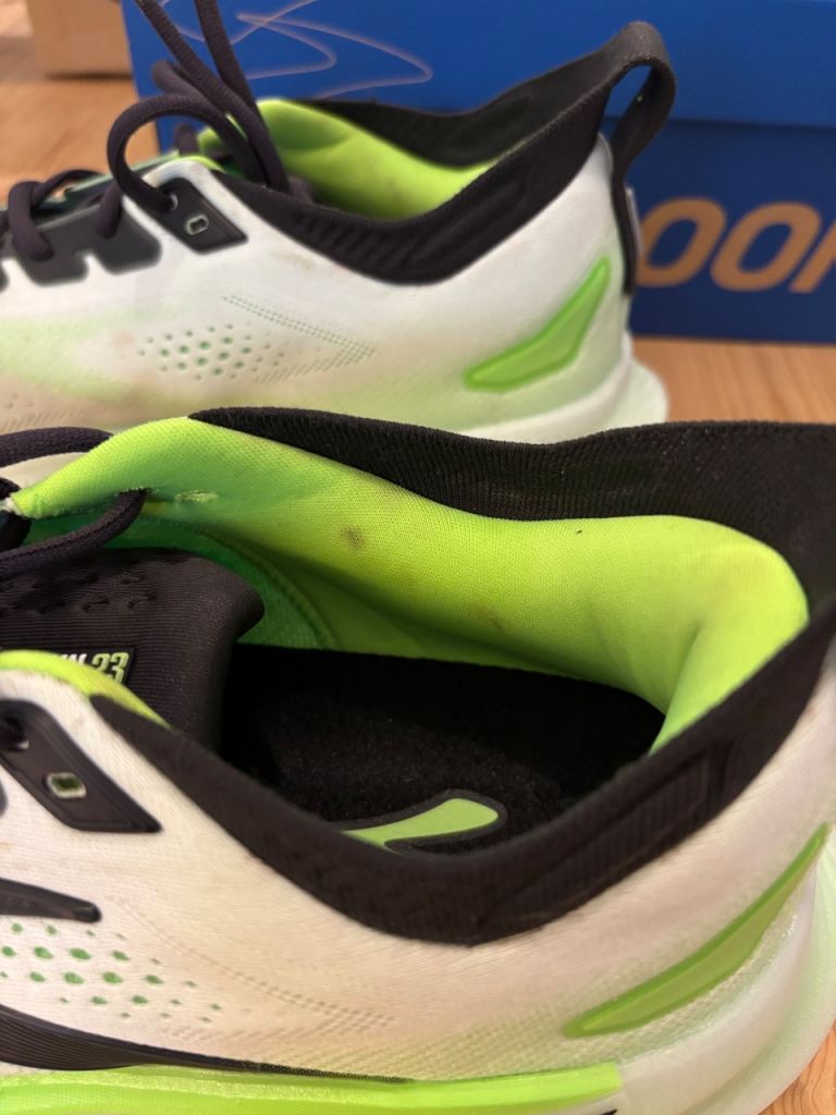 I have run outside in these shoes about 10 miles or so as I was not able to fully test the sizing by walking about in the shop. Unfortunately it was wet and muddy on my route which has marked areas of the shoes (see images) - I have removed as much as I can with a damp cloth but some areas appear lightly stained - must be a ‘feature’ of this particular colourway which to be fair is not the greatest choice for muddy running if ultra clean trainers are your thing. The reason for sale is that the fit did not work out for me, so hopefully someone out there can make good use of these premium running shoes. The insoles have not been used at all so they are as new (I put my own insoles in to run in them). They are in pretty much new condition apart from the marking on the uppers so I have priced accordingly.