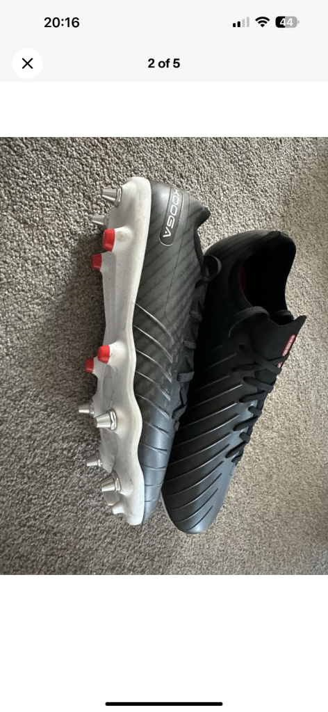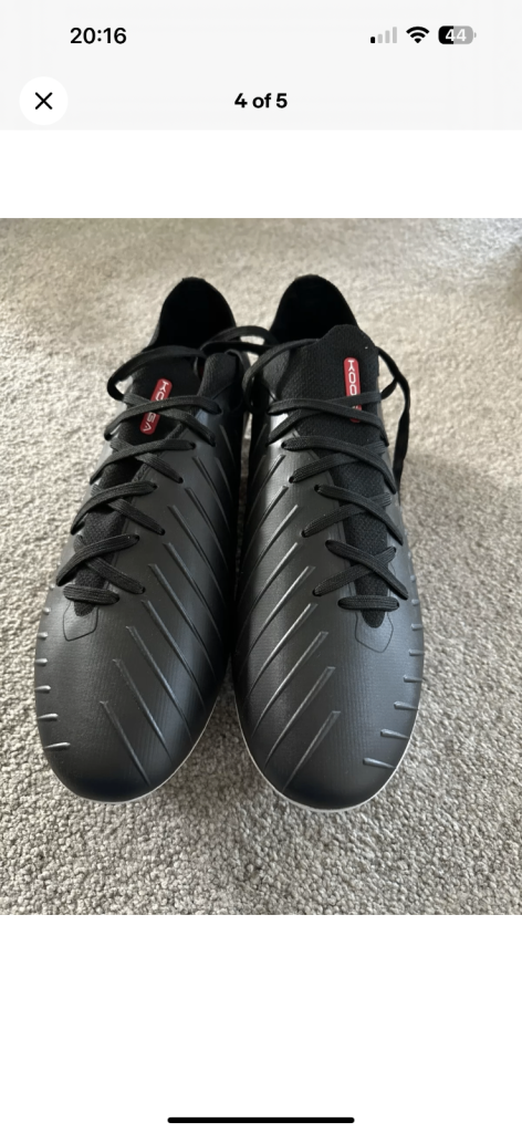 The Kooga Rapid Mens Rugby Boots are perfect for matches or training sessions, featuring a shaped ankle collar coupled with a classic lacing system that locks your foot down into the shoe for a secure fit. A moulded soleplate with screw in conical studs offer fantastic traction for sudden turns and stops, a printed design across the upper along with the Kooga branding completes the look. Soleplate / Ground Type Firm Ground Upper Material Synthetic Class P4 - CLUB Fastenings Lace Up Lining Synthetic Style Rugby Boots uk 9.5 Never been used Comes without box