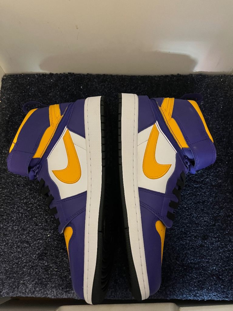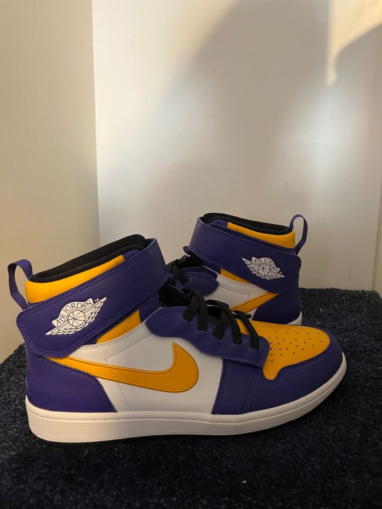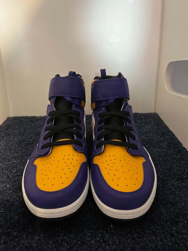 The Nike Air Jordan 1 High FlyEase 'Lakers' is a stylish and comfortable high top trainer designed for men. Featuring the iconic Air Jordan 1 model, this shoe is perfect for casual occasions and showcases the signature Nike brand. The lace-up closure and standard shoe width provide a secure and comfortable fit, while the rubber cleat type offers good traction. With a multicoloured design and leather upper material, this shoe is a fashionable choice for any basketball enthusiast looking for a quality sneaker.
