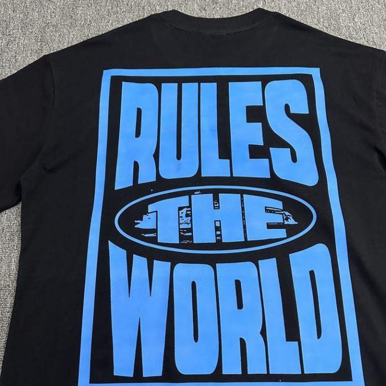 Sleek black tee with a bright blue Alcatraz graphic (chest) and bold "RULES THE WORLD" slogan (back, layered with the prison print). Sharp, high-contrast streetwear essential.