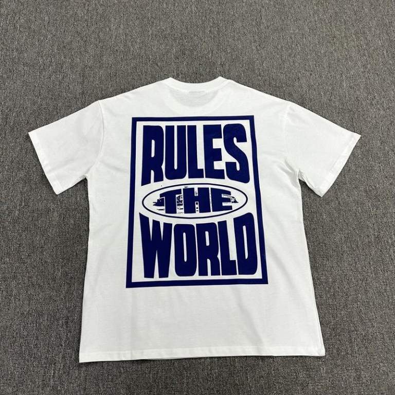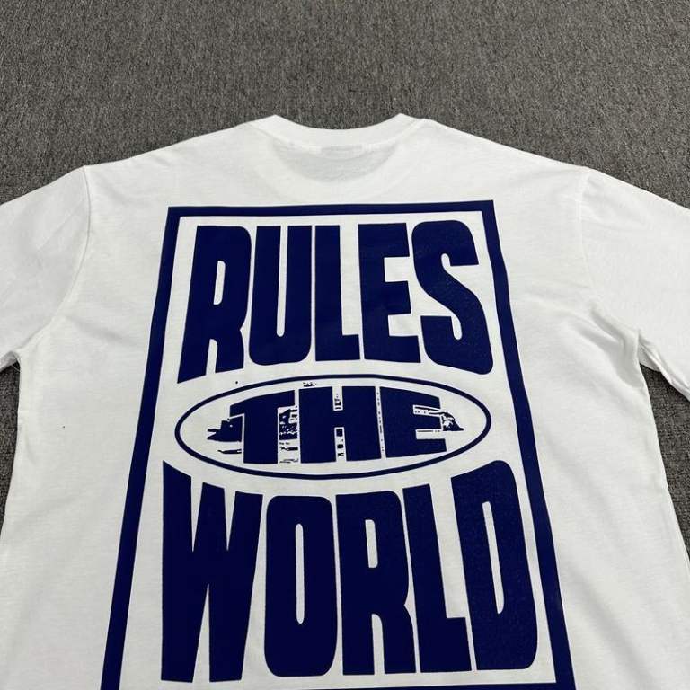 Clean white tee with a small Alcatraz graphic (chest) and bold "RULES THE WORLD" slogan (back, paired with the prison print). Edgy, statement-making streetwear staple.