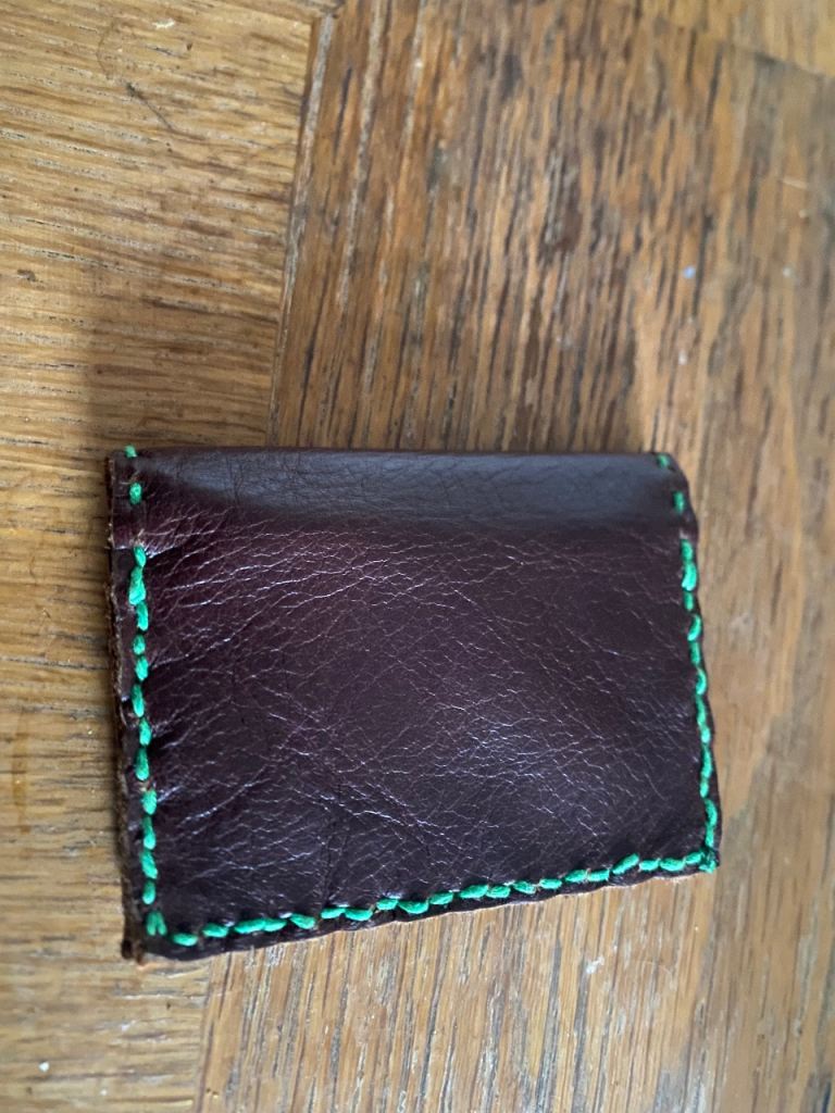Handmade brown leather wallet with green stitching. Room for 2 cards and folded notes.