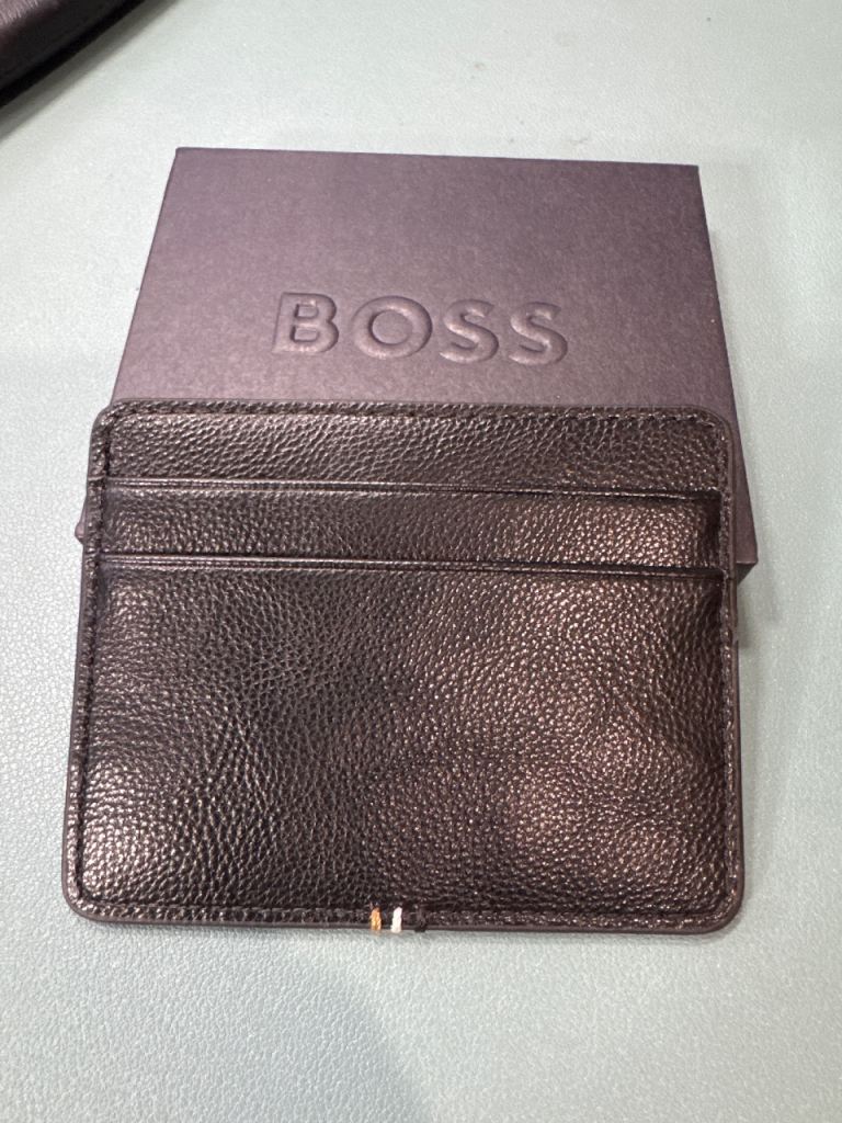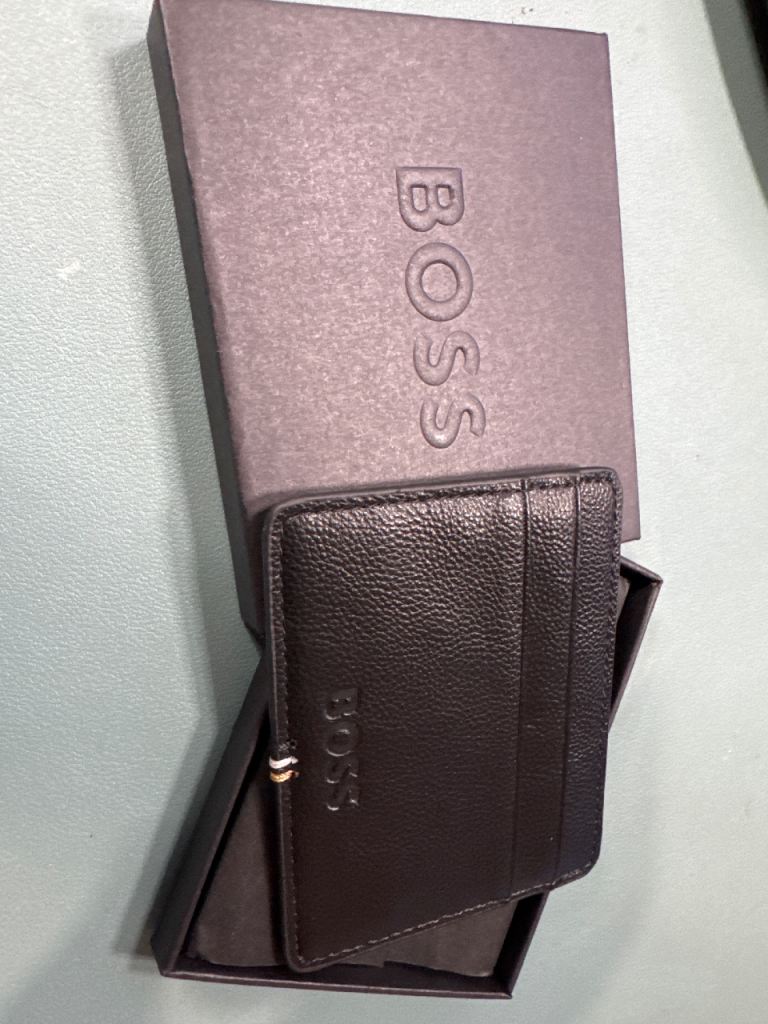 Black leather Hugo Boss wallet. Features 6 credit card slots and a central pocket for notes etc.