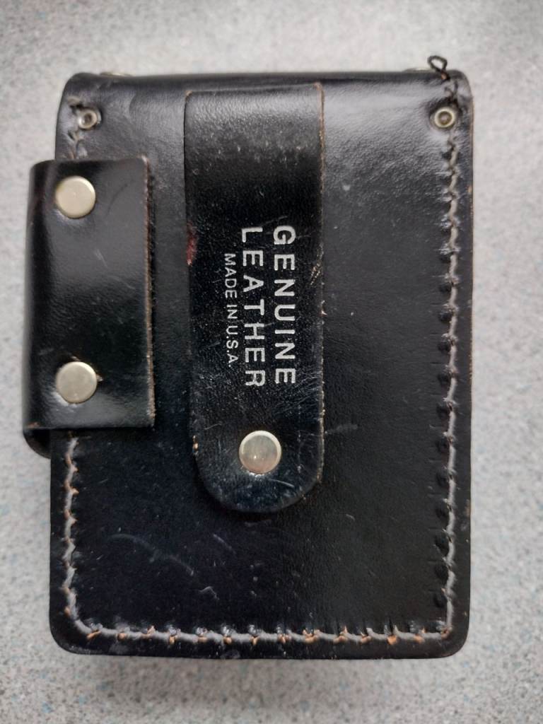 Vintage Thick Black Leather Belt Pouch, with chrome stud detail, a side pocket & push & slide closure on the lid flap, size 4 X 5 inches.