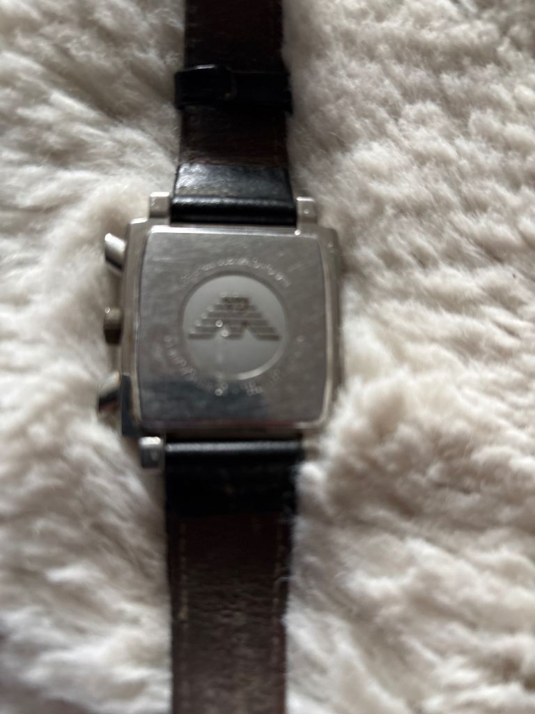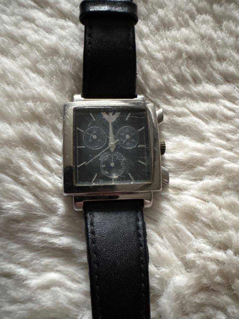 Armani Exchange watch, square face with a black leather strap.