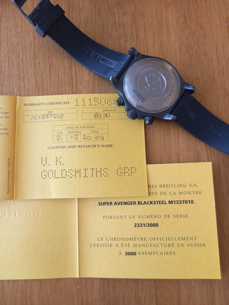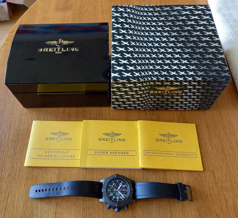 Black steel version of Super Avenger. 48mm case. Comes with boxes and paperwork.