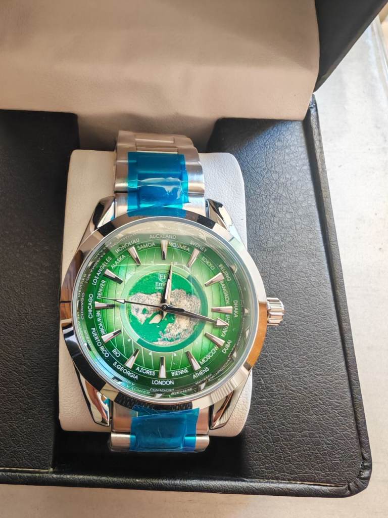 ERNEST FERDINAND MEN'S WATCH. FEATURING A GREEN GLOBE DIAL. GOLD COLOURED MARKERS AND HANDS, GOLD COLOURED BEZEL, W/R 3ATM. STAINLESS STEEL CASE AND BRACELET. BRAND NEW IN A PRESENTATION BOX.