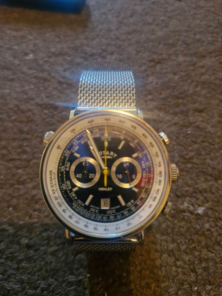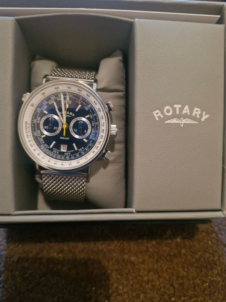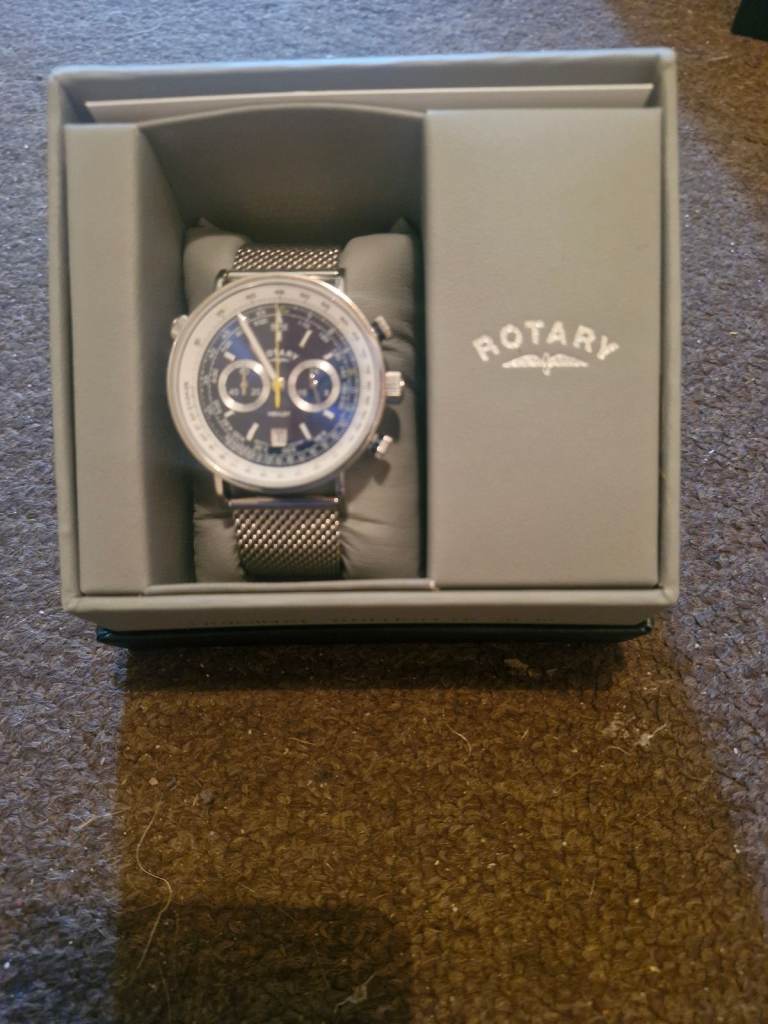 Highly intricately detailed Rotary timepiece with stainless steel mesh bracelet. The 42mm stainless steel case is encompassed with scratch-resistant sapphire glass and is water resistant to 50m