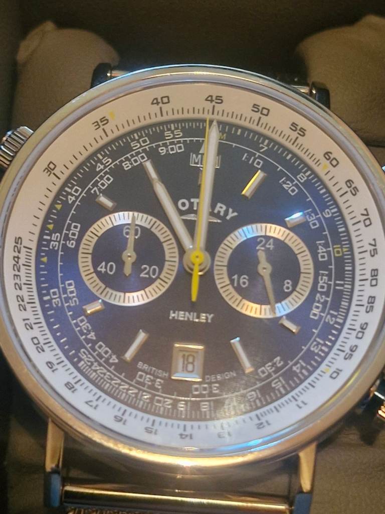 The vibrant mid blue dial features two sub dials and a counter sunk date window at 6 O’clock. Featuring a sliding clasp and circular slide rule features a mobile bidirectional bezel and second fixed scale on the dial , with reference points in luminous yellow on both the inner and outer scales.