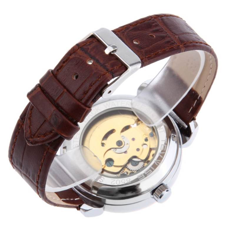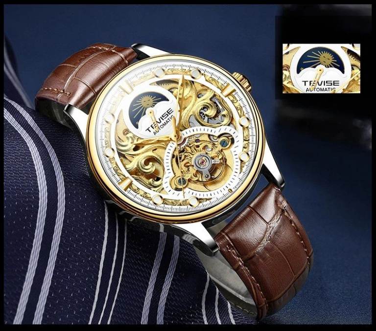 Gents White / Gold Skeleton Face Watch Tourbillon, Black Genuine Leather Strap
