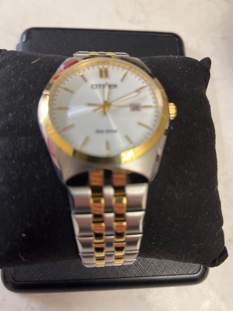 Two tone gold coloured and stainless steel . Solar powered . Water resistant 100m . Immaculate condition and very accurate. Original box . Still under warranty.