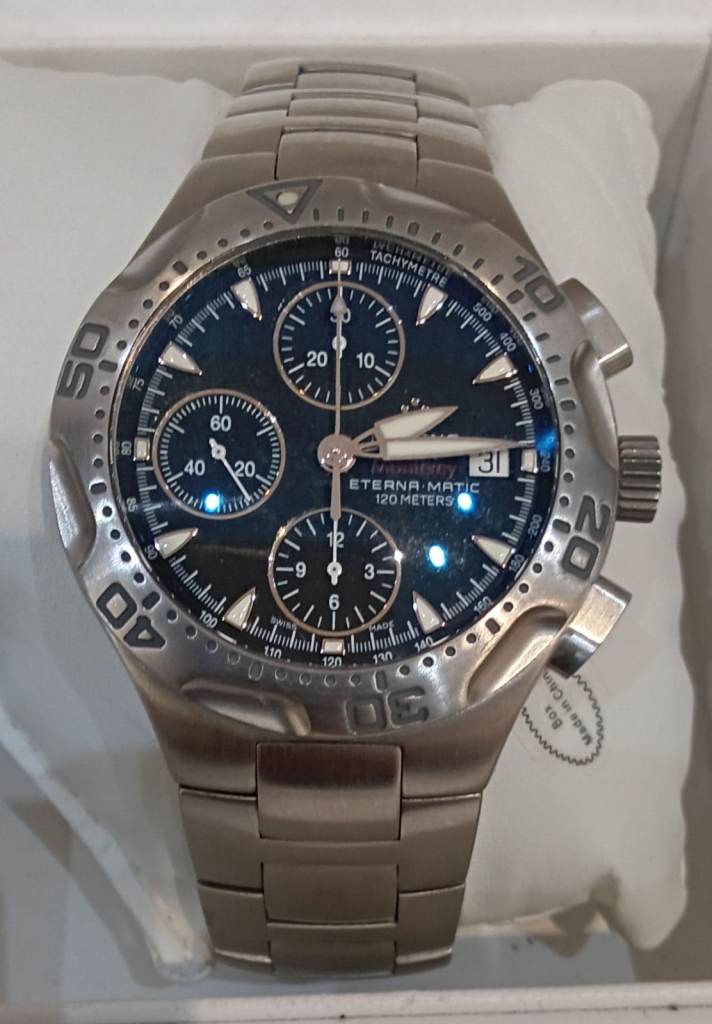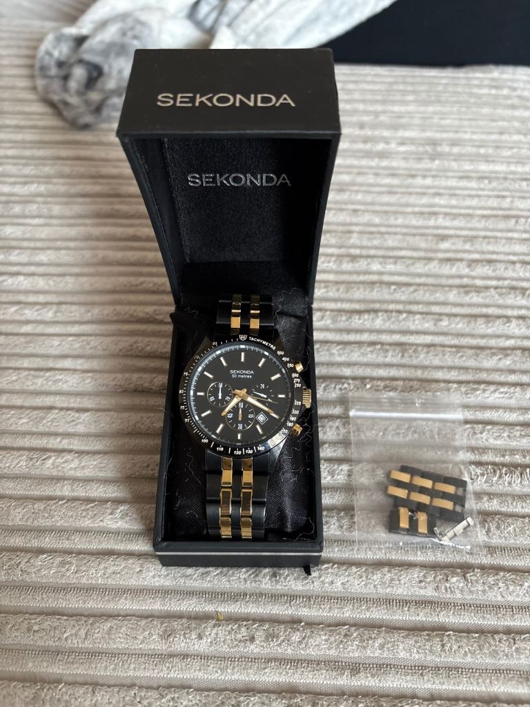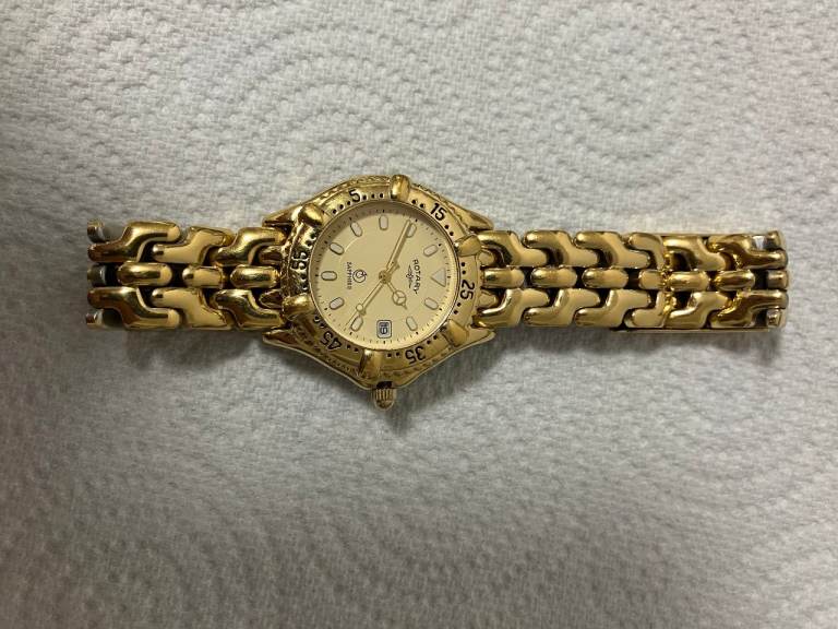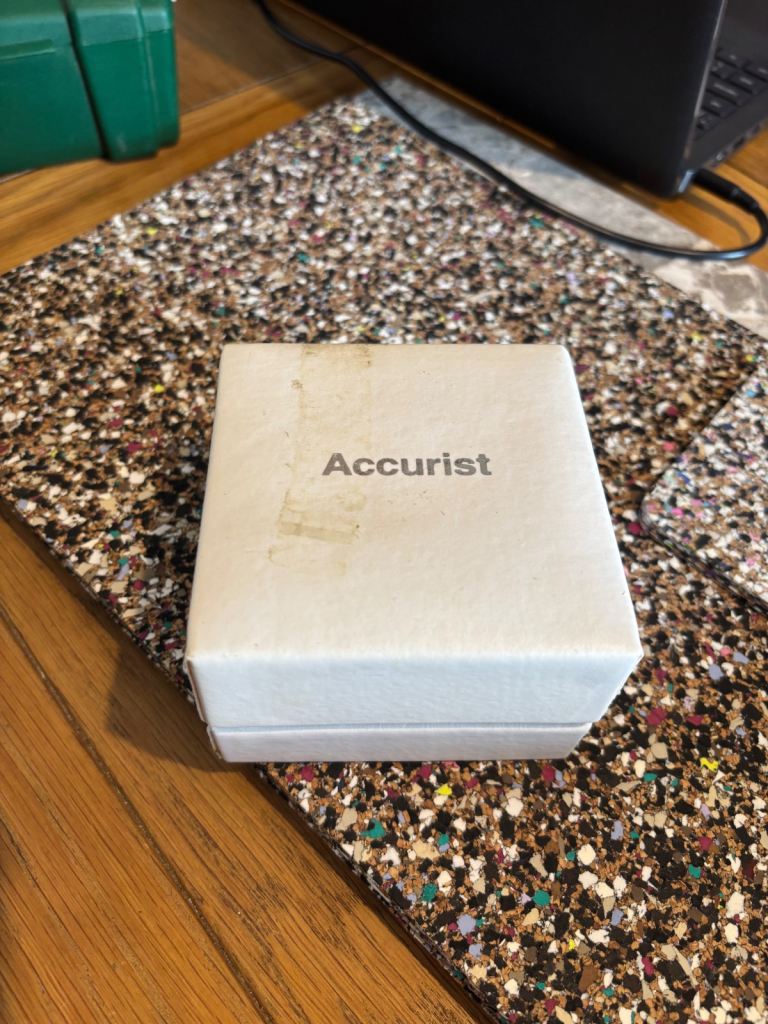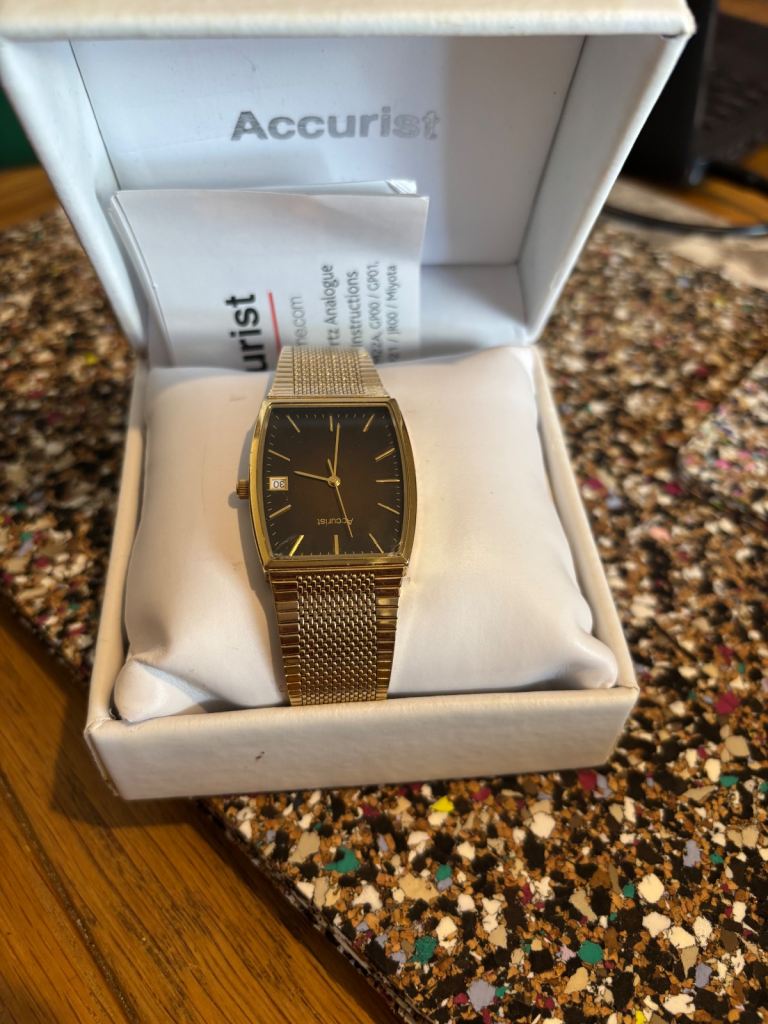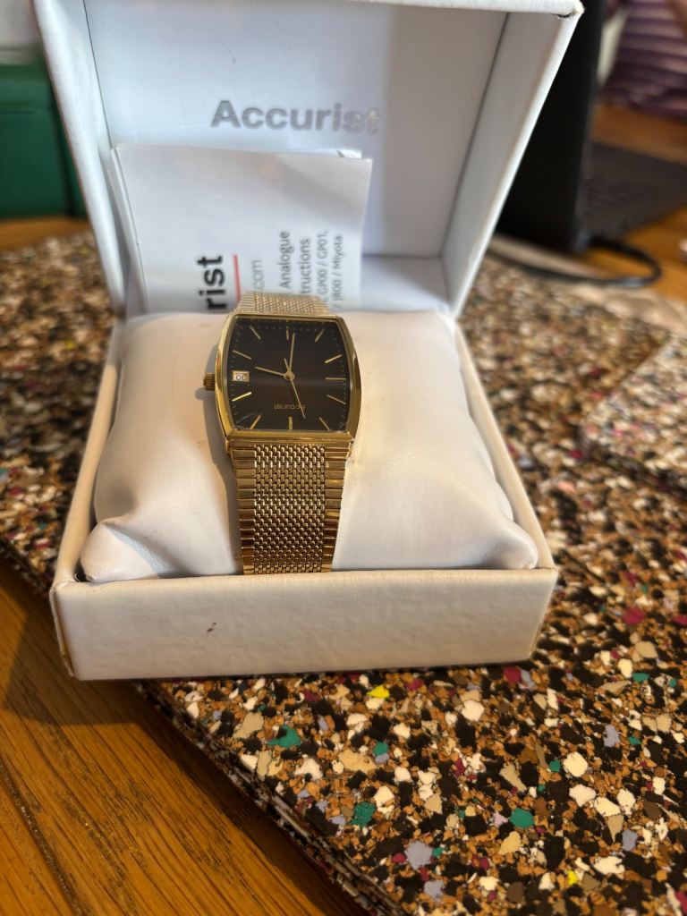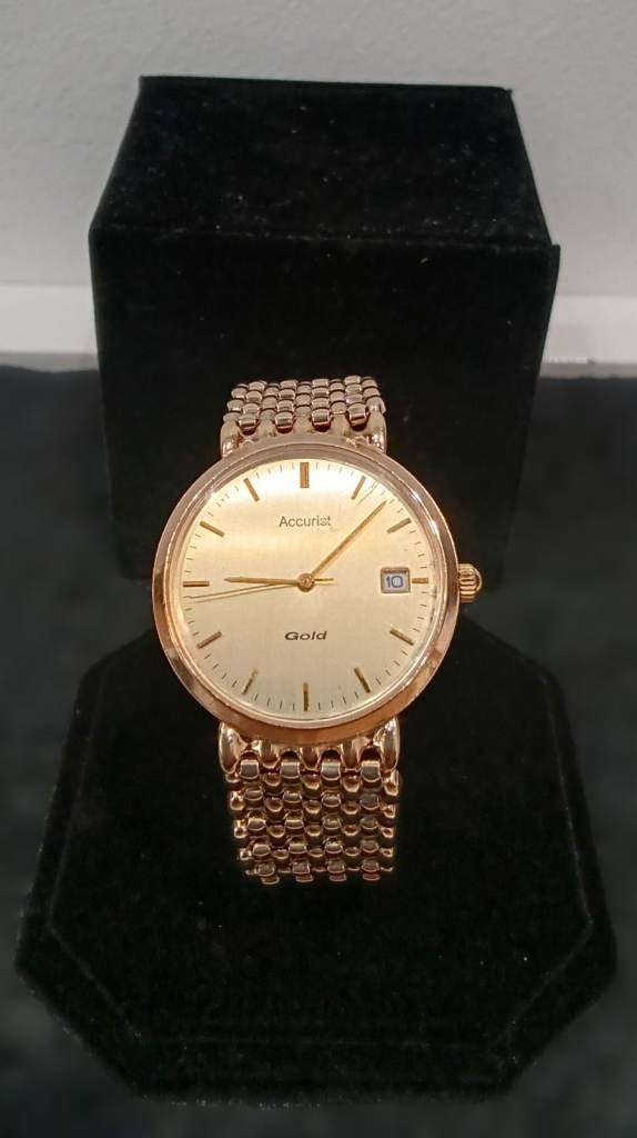Men’s accurist dress watch, really nice dress watch gold band black face slight unnoticeable crack in right hand corner of face but otherwise works well with a replacement battery