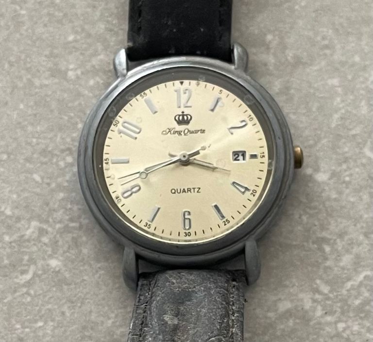 Used Mens King Quartz Quartz Watch stainless steel and black leather strap