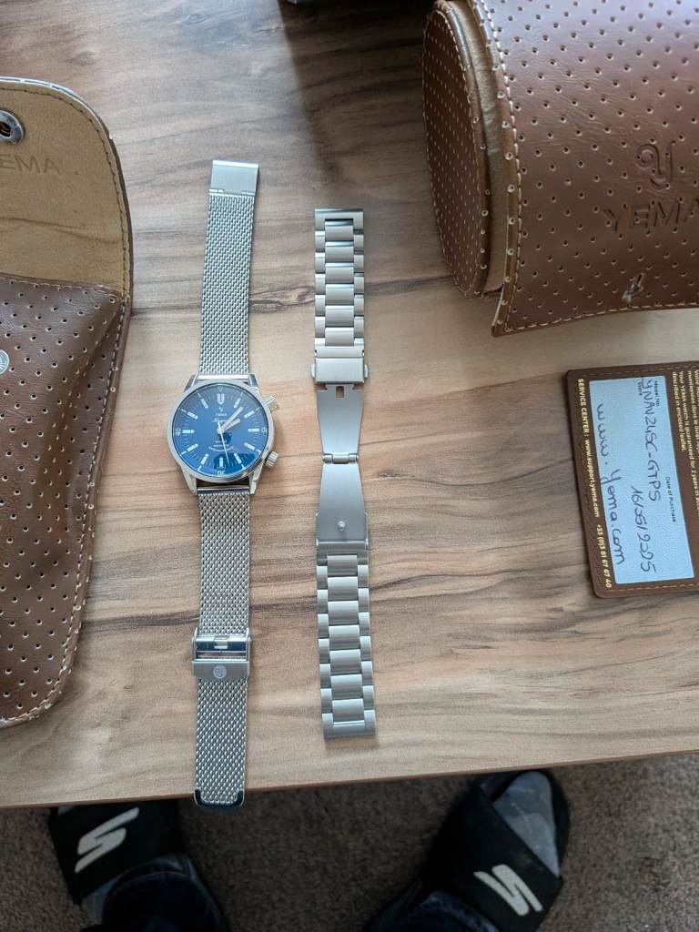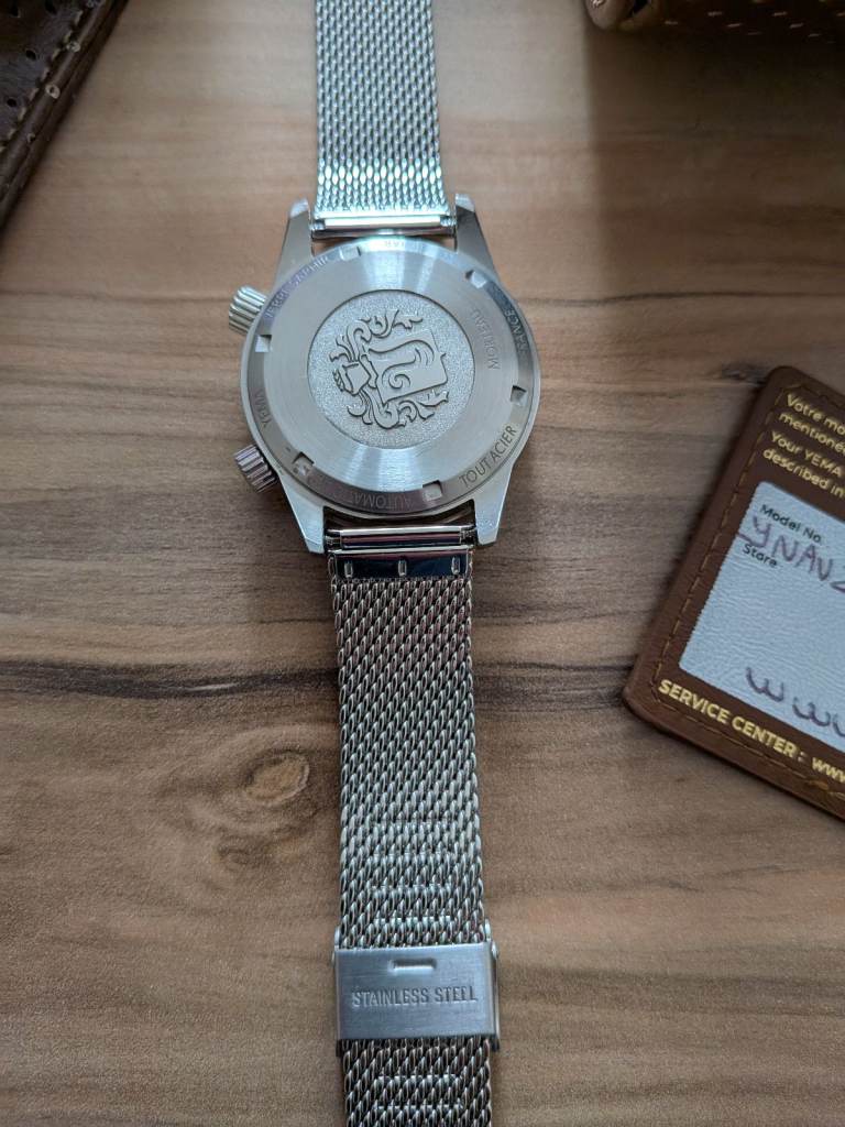 May 2025 purchase for £800,this lovely timepiece isn't getting enough wrist time. Featuring a case that tightens under pressure and bidirectional internal bezel complimented by a comfortable OEM stainless steel Milanese mesh strap and unworn Yema rubber dive strap. Comes with box, leather watch roll and generic bracelet. Recently regulated by the manufacturer and keeping excellent time.