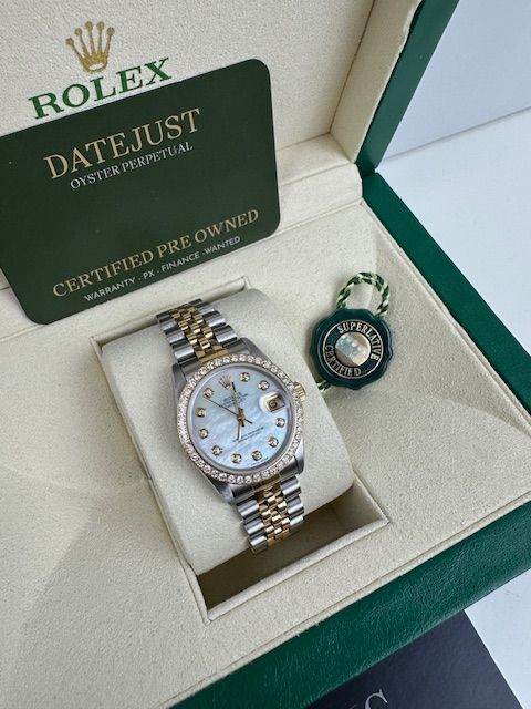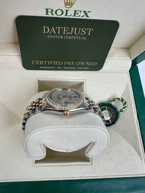 ROLEX DATEJUST 68273 ,MOTHER OF PEARL DIAL CUSTOM STONE SET BEZEL , WITH BOX NATIONAL CERTIFICATES AUTHENTICITY VALUATION, WITH WARRANTY PX POSSIBLE CHOICE OF AROUND 80 ALL STYLES , COLLECTION FROM LEEDS JEWELLERS FINANCE AVAILABLE