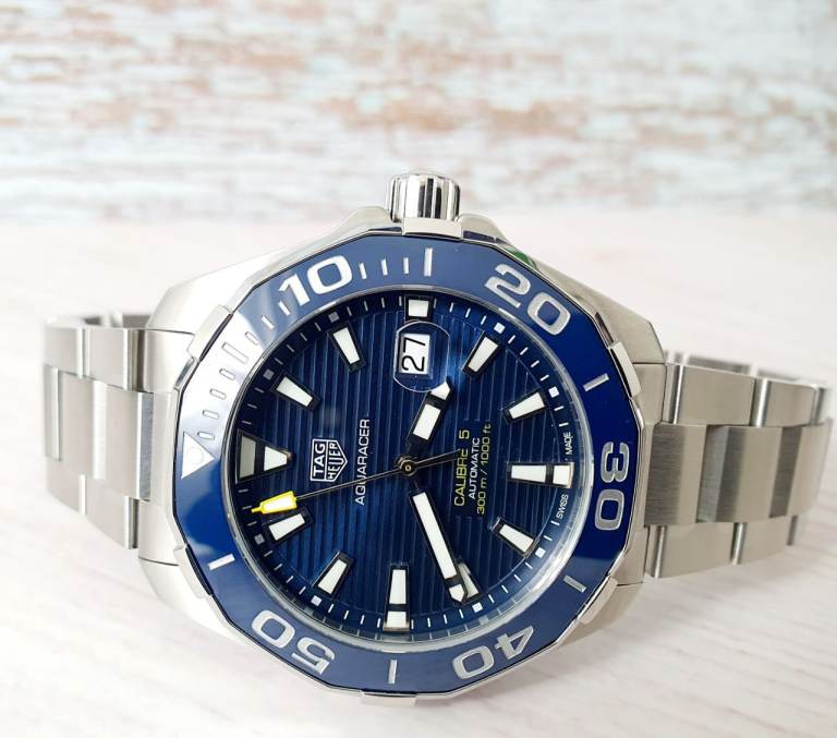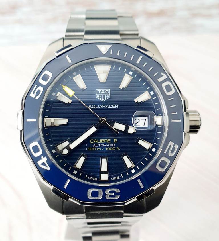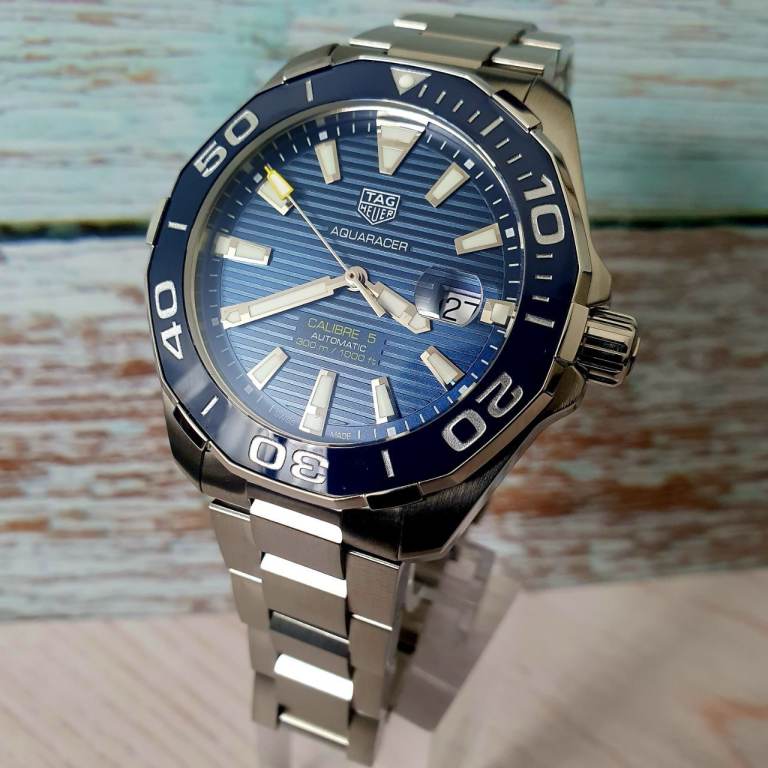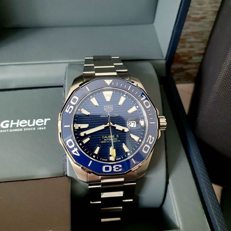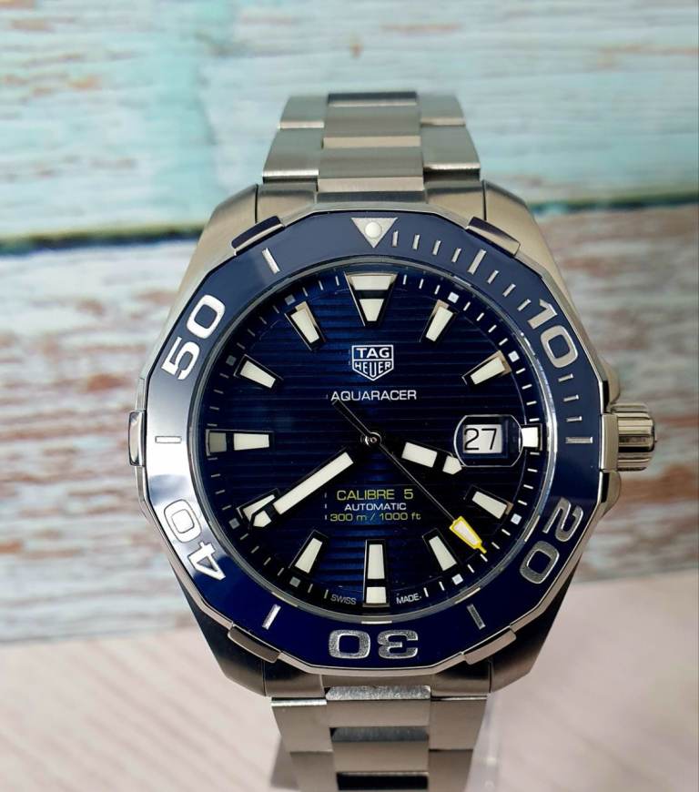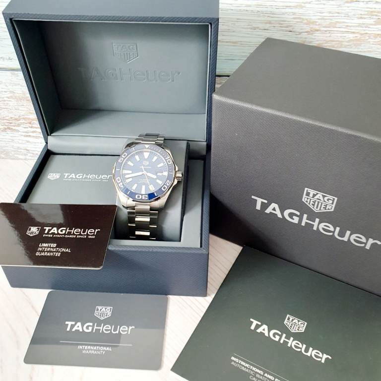 Case diameter: 43 mm, Windshield: Sapphire crystal, Specifications: Diver’s, Ceramic rotating bezel, Date display, Case material: Stainless steel, Bracelet material: Stainless steel, Dial color: Blue, Accessories: Manufacturer's original TAG Heuer box, Purchase receipt, International warranty card, retailers card, instructions manual booklet, movement: automatic movement calibre 5, Water resistance: 300m, model number: WAY201B.BA0927, Condition: excellent, no scratches, watch is around 2 and half years old.