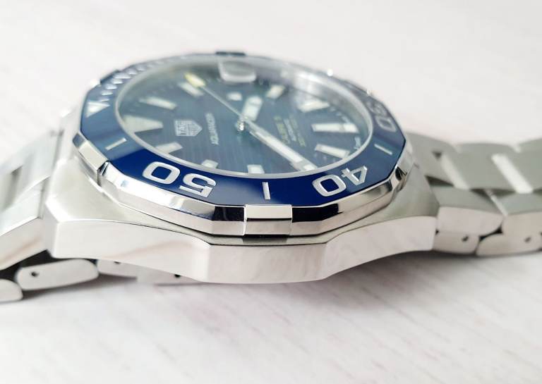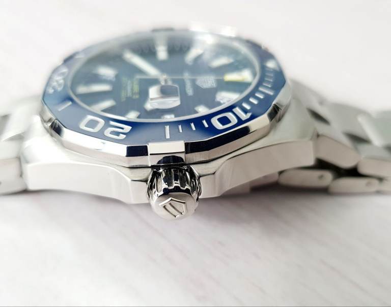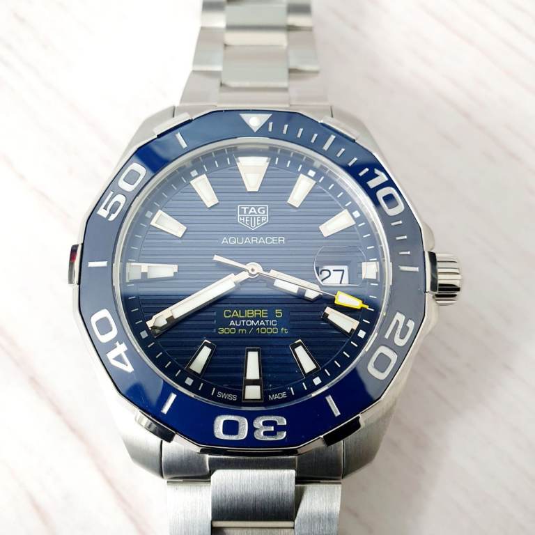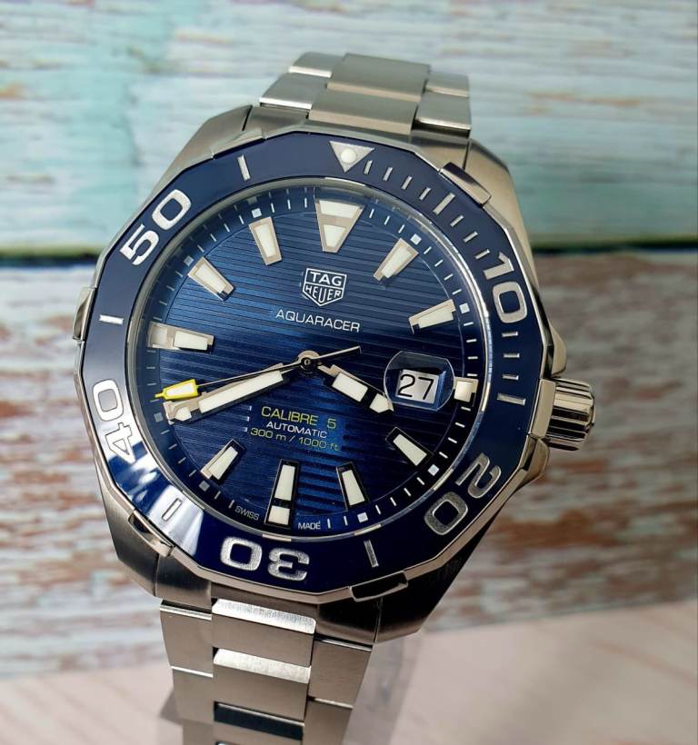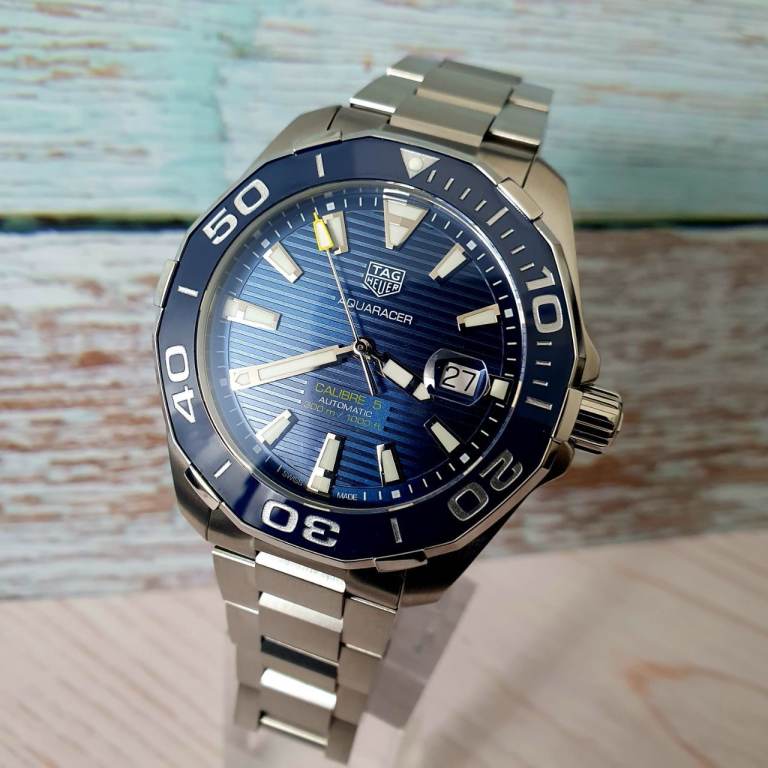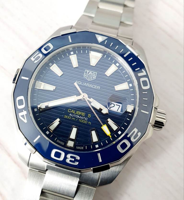 Case diameter: 43 mm, Windshield: Sapphire crystal, Specifications: Diver’s, Ceramic rotating bezel, Date display, Case material: Stainless steel, Bracelet material: Stainless steel, Dial color: Blue, Accessories: Manufacturer's original TAG Heuer box, Purchase receipt, International warranty card, retailers card, instructions manual booklet, movement: automatic movement calibre 5, Water resistance: 300m, model number: WAY201B.BA0927, Condition: excellent, no scratches, watch is around 2 and half years old.