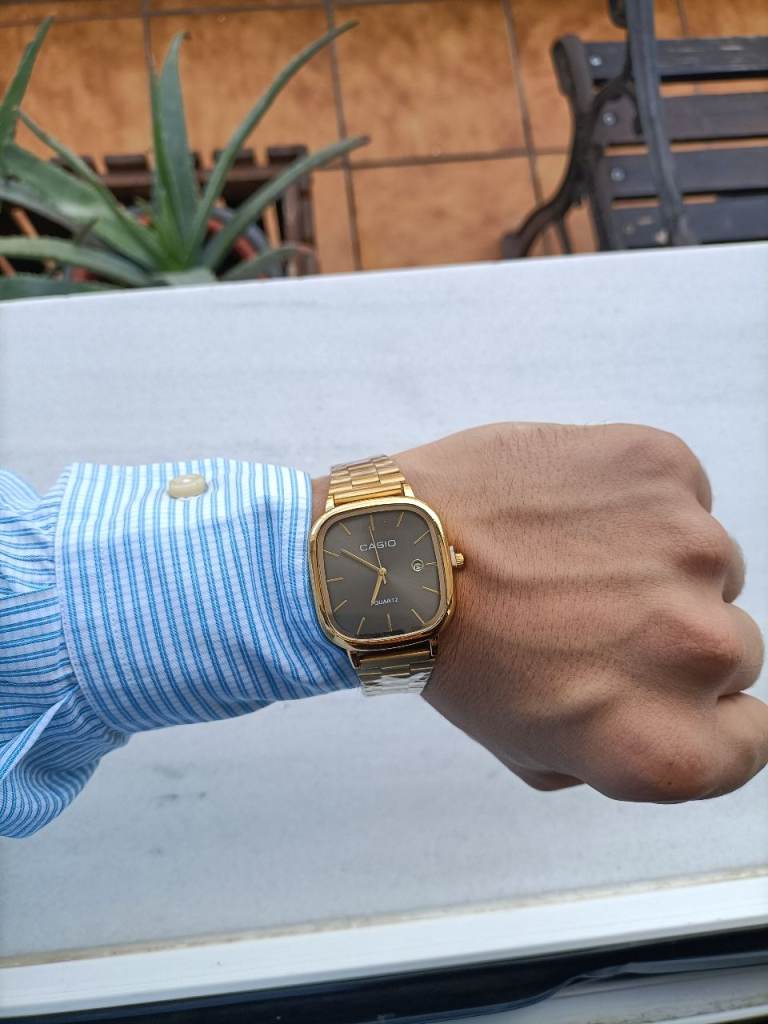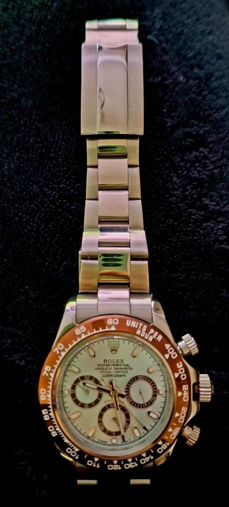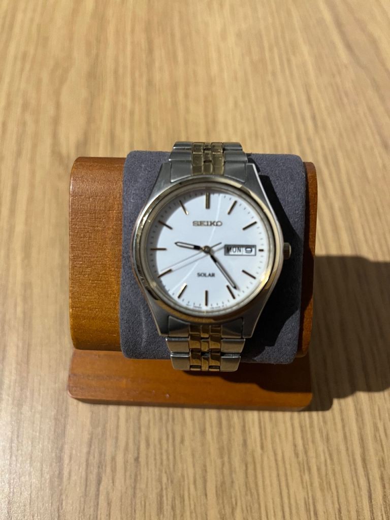 41 mm stainless steel case, black dial, Swiss quartz movement.