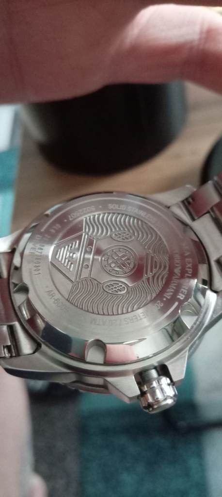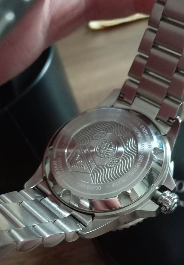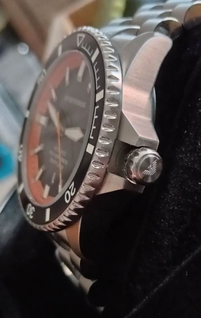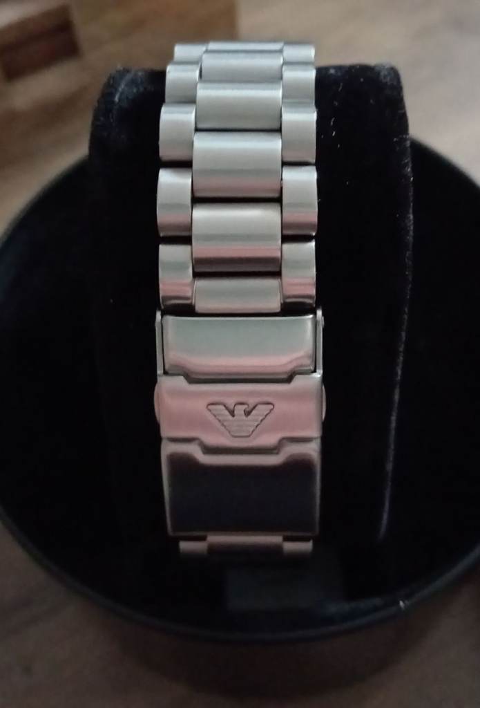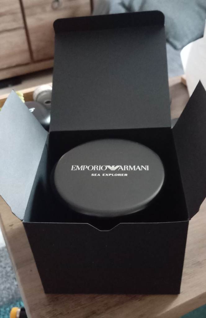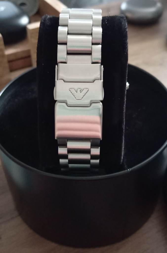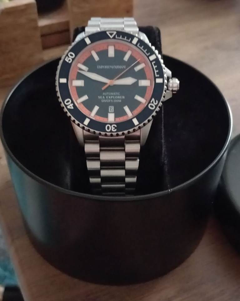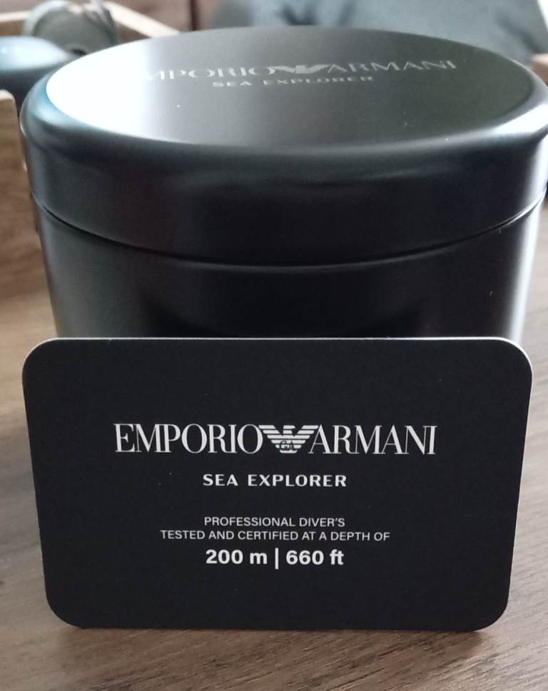The Emporio Armani Sea Dive automatic men's watch features a stainless steel strap, a blue dial, and a silver case. This stylish timepiece is designed with baton indexes, a chronograph function, and a left-handed escapement. It comes with a 2-year manufacturer warranty, original box and packaging, and service records. The watch is a great choice for those looking for a high-quality wristwatch with a modern design and reliable features. Brand new with box and papers