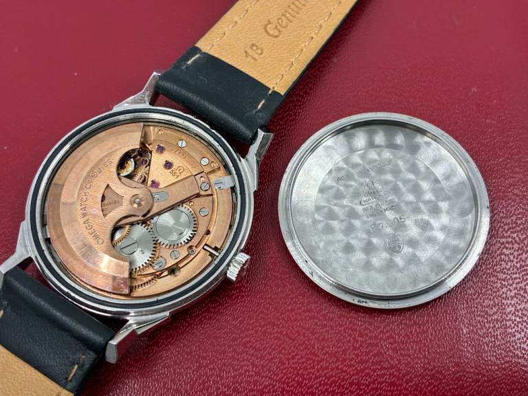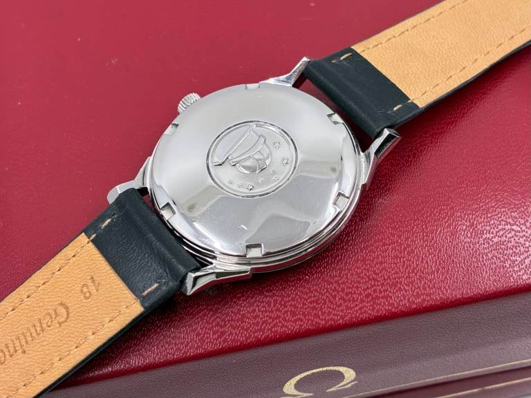 The watch has a beautiful stainless steel case with 'dog leg' shaped lugs. The case measures 34mm in diameter excluding the signed Omega crown. For its age, the case is in very nice condition. it has some light signs of wear and a small nick on the case back. The Omega Observatory logo to the case back is in great condition.
