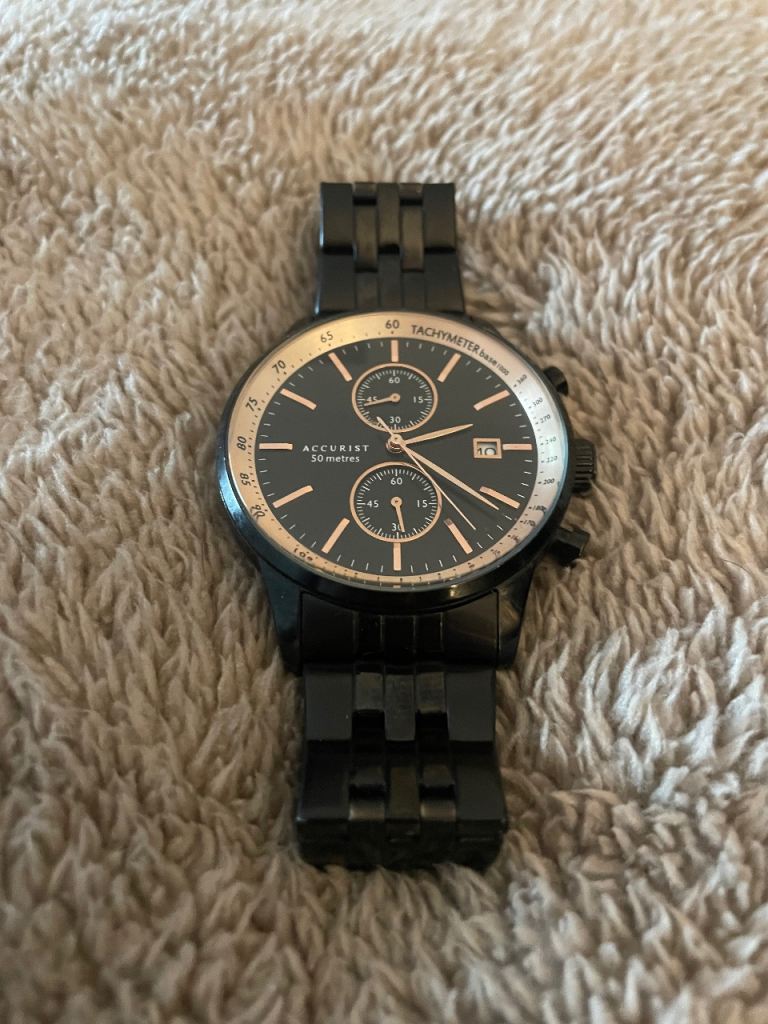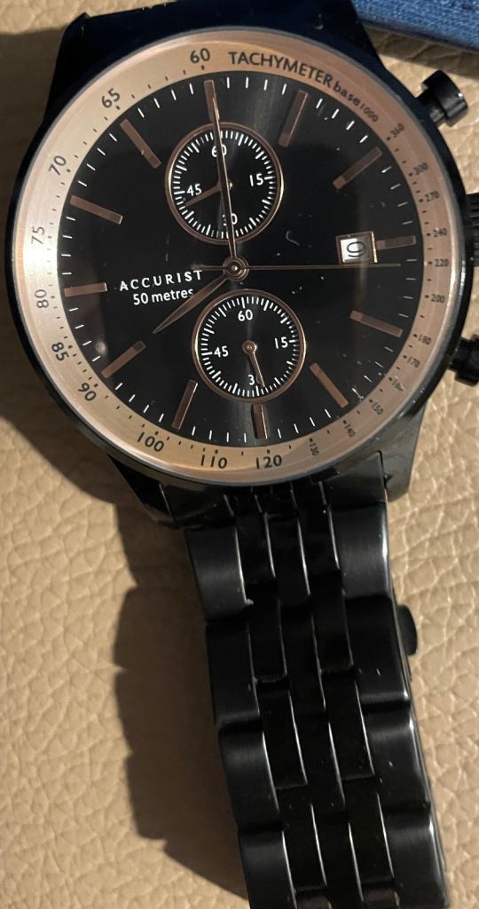 Accurist 7341 Mens Chronograph 44mm Watch with Black Sunray Dial and Rose Gold Plated Chapter Ring rarely worn no box or instructions included