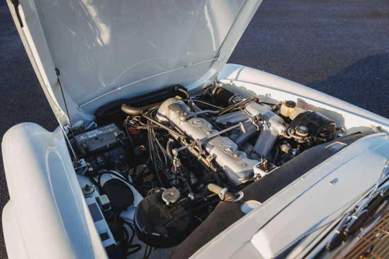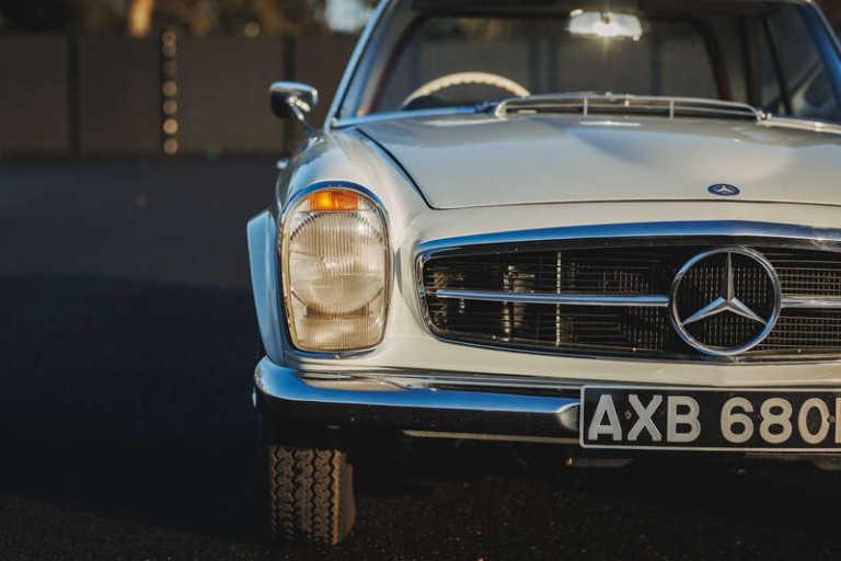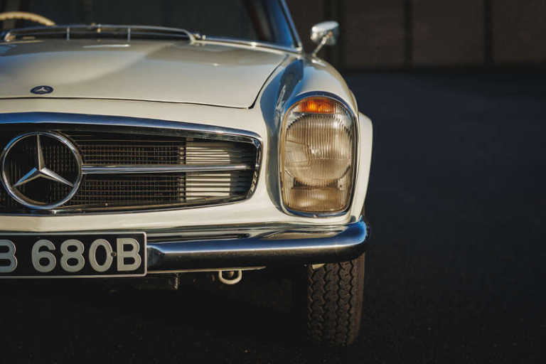 This lot will be auctioned via Iconic Auctioneers, The Classic Sale at the Practical Classics Classic Car and Restoration Show 2026 on Saturday the 21st of March - Sunday the 22nd of March, NEC, Birmingham, B40 1NT. , Introduced in 1963 and produced until 1971, the Paul Bracq-designed W113 SL range replaced the 190 SL and 300 SL, blending sporting intent with comfort and safety, with the 230 SL as the first iteration and now well established in the collector market,Powered by a 2,306cc straight-six engine with mechanical fuel injection offering 150bhp and 145lb/ft of torque driving the rear wheels through a manual gearbox and benefiting from independent rear suspension for assured road manners,First registered on 15th May 1964 to Lady Katie Fraser of Allander, wife of Sir Hugh Fraser, it was garaged for much of its life with long-term family ownership from 1996 and current ownership since 2018, having seen little use and extended periods in storage,Presented in Mercedes White (050) white with a dark blue removable hardtop complemented by a dark blue leather interior, and specified with the optional side-facing third seat,Fitted with a stainless steel exhaust. We understand that the car will be serviced prior to our sale,Supplied with MOT certificates dating back to 1981, the original buff log book, sundry invoices, the original spare wheel and Mercedes-Benz jack,This original UK-delivered, right-hand drive 230 SL with manual transmission presents an appealing opportunity to acquire a usable and collectible Pagoda,