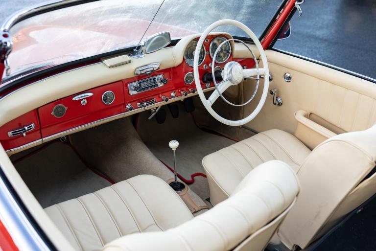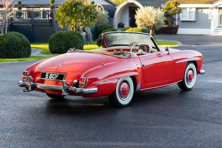 This Lot will be sold at auction at Symphony of Spring; Ascot Racecourse on Saturday 7th March. A low mileage right hand drive exampleJust had over £12,000 spent on itStill bearing its original number plate of 5 BOFThe Mercedes-Benz 190 SL is one of the most iconic classic roadsters of the 1950s and 1960s, combining elegant design, comfort, and accessible performance. First introduced at the 1954 New York Auto Show and produced between 1955 and 1963, the 190 SL quickly gained a reputation as a stylish yet practical alternative to its more exclusive sibling, the Mercedes-Benz 300 SL Gullwing. At its core, the 190 SL was designed for buyers who wanted the glamour and prestige of a Mercedes sports car but at a more approachable price. Built on a shortened version of the W121 saloon platform, the car featured a 1.9 litre in-line four-cylinder engine producing around 104 horsepower. While it did not match the raw performance of the 300 SLs six-cylinder engine, the 190 SL offered smooth handling, refined driving characteristics, and reliability that made it suitable for both city use and long-distance touring. It could reach a top speed of approximately 107mph, more than adequate for the era. One of the cars most enduring qualities is its timeless styling. Its interior echoed Mercedes-Benzs commitment to luxury, featuring high-quality materials, leather upholstery, and clear, elegant instrumentation. Owners appreciated its blend of comfort and sportiness, a balance that helped it appeal to a broad range of enthusiasts. Throughout its production run, around 25,881 units of the 190 SL were built, making it a relatively rare but not unattainable collectors car today. Its connection to the legendary 300 SL, along with its classic good looks, has made it highly desirable among vintage car enthusiasts. Well-preserved or fully restored examples often command significant prices at auctions and private sales.Only a few right-hand drive examples were supplied new to the UK market during the 1959 model year, this example was one of those few, chassis 121.040-20-014566 was originally finished in the striking colour of red with a new beige hood. Issued with registration number 5 BOF on 23rd September 1959 and still retaining the number, this example has spent the majority of its life in Surrey. One of only 562 units manufactured by Mercedes-Benz in right hand drive guise throughout the eight-year production run, this 190 SL presents exceedingly well. The vendor has just spent circa £12,000 on this Mercedes-Benz, including new carburettors, fuel pump and a thorough engine tune. Shod with a good set of whitewall tyres which help accentuate the shiny Fire Engine Red paintwork. The glovebox has an inset clock and the dashboard carries a Becker Mexico radio which is thought to be original to the car. Ultimately, the Mercedes-Benz 190 SL stands as a car that embodied the glamour of postwar Europe and the growing international reputation of Mercedes-Benz. It wasnt the fastest sports car of its time, but it delivered style, quality, and everyday usability, making it an enduring classic and a cornerstone of Mercedes-Benzs rich heritage in open-top motoring. Consigned by Stewart Banks.