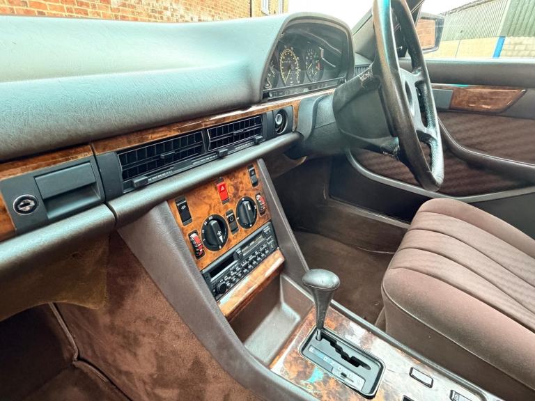 Inside, the cabin remains an object lesson in Mercedes-Benz quality. The switchgear operates with the precise, damped action for which the marque became famous, the walnut trim retains its depth and finish, and even the original Blaupunkt radio cassette remains fitted, a rare and increasingly desirable detail that underscores the car’s authenticity.