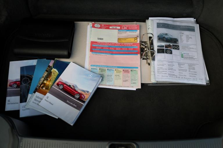 As can be seen from the provenance and large service history portfolio, this SL has been very well maintained by a fastidious owner. This example has covered a genuine low mileage and been the owners pride and joy. The 3.5 litre engine is powerful, efficient and very reliable with smooth, effortless progress. The 7 speed automatic is equally smooth making for swift, relaxing progress. With 17 inch wheels, ride quality is also superb and much comfier than models with AMG Wheels and Sport Suspension. Premium Continental tyres all round with 6mm tread, another sign of how the car has been maintained. New convenience battery fitted 2023. Superb service and VOSA MOT history. Any test drive or inspection welcome.