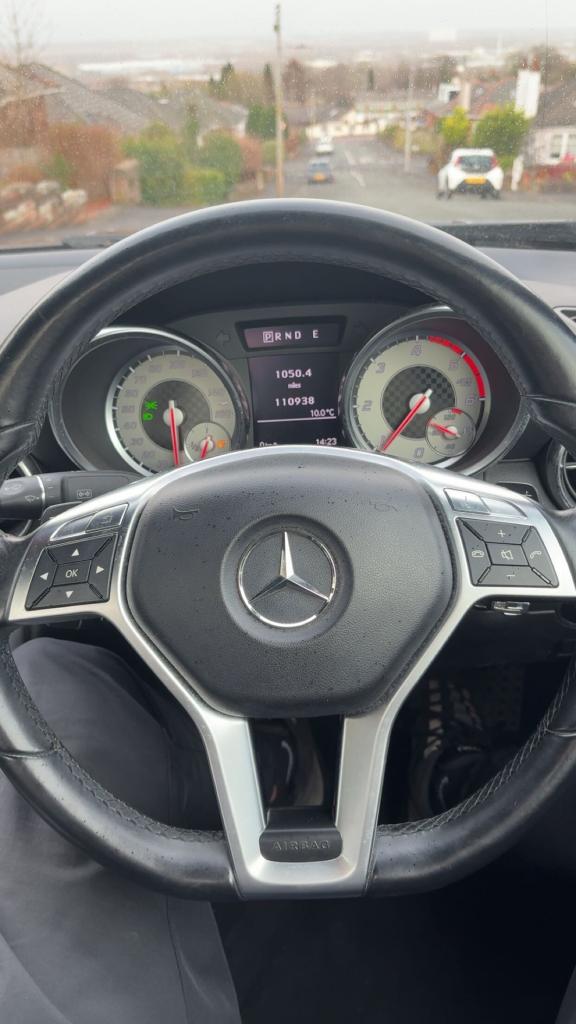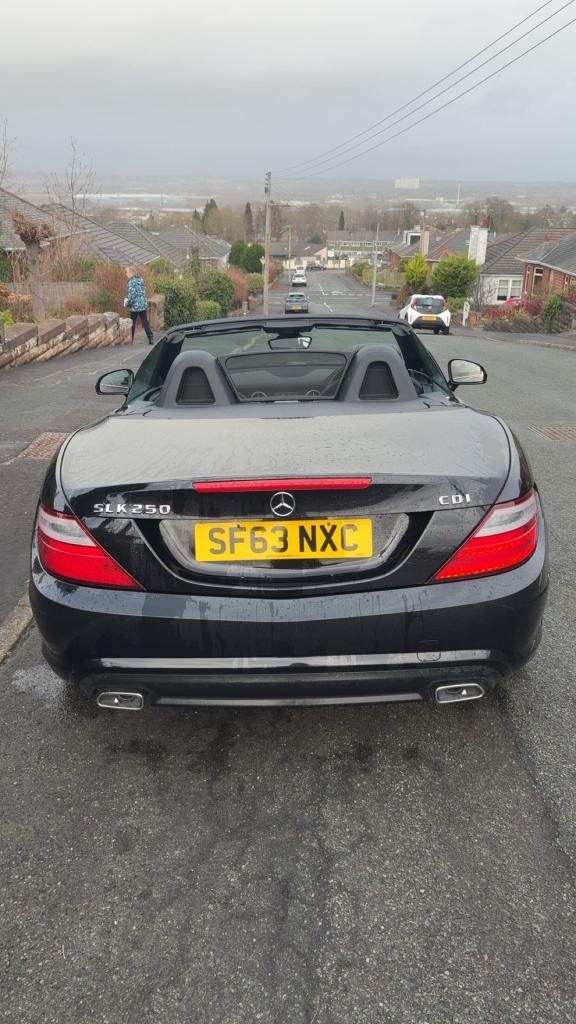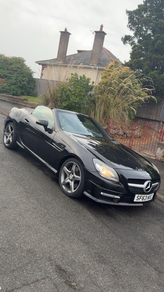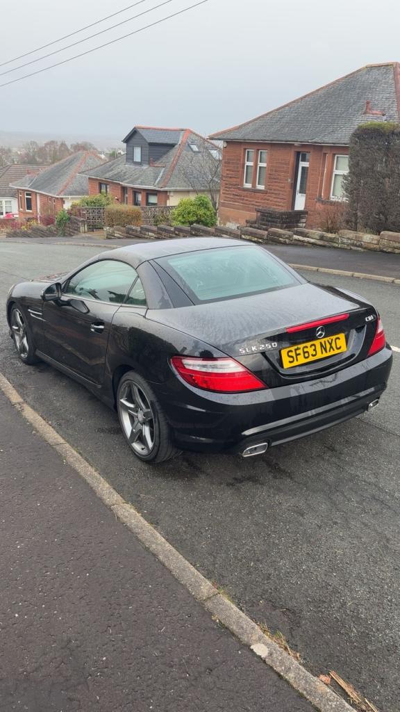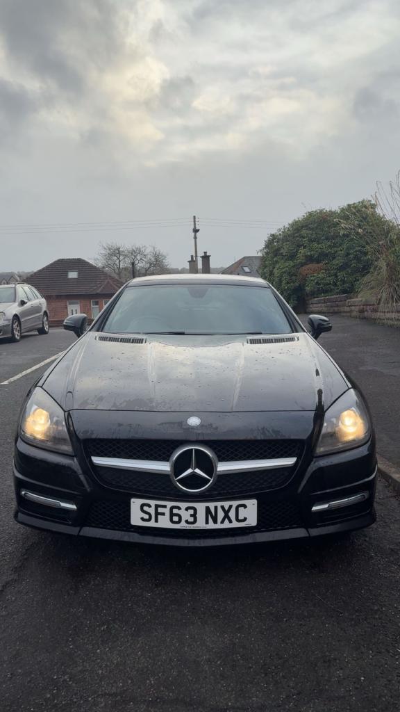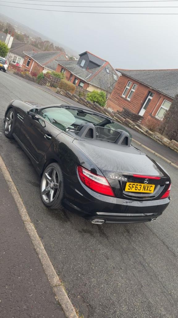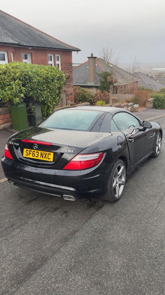 Mercedes Slk250 AMG sport cdi blue efficiency 7G automatic convertible ,2013 63 reg, black with black leather interior, recently refurbished alloy wheels in gun metal grey, electric windows and mirrors, multifunction steering wheel, Bluetooth, cruise control, sat nav, MOTd April 2026 110,000 miles, only 2 owners, 2 keys , service history £5950