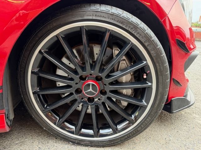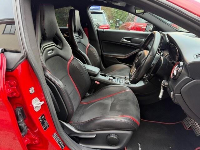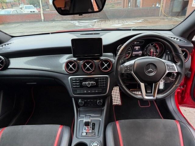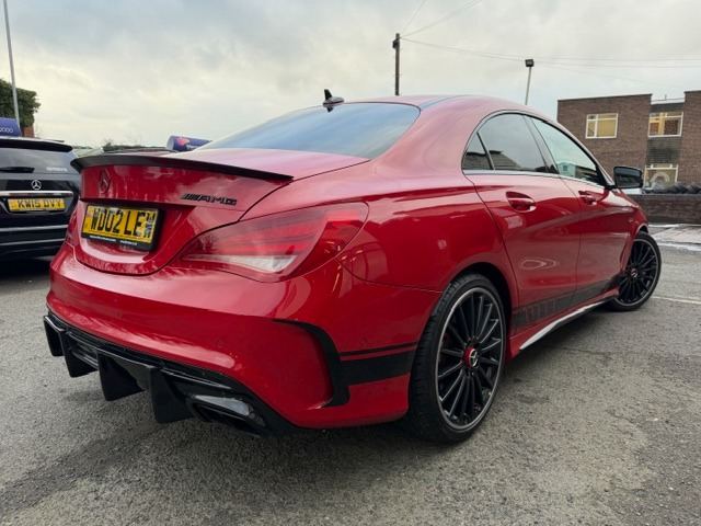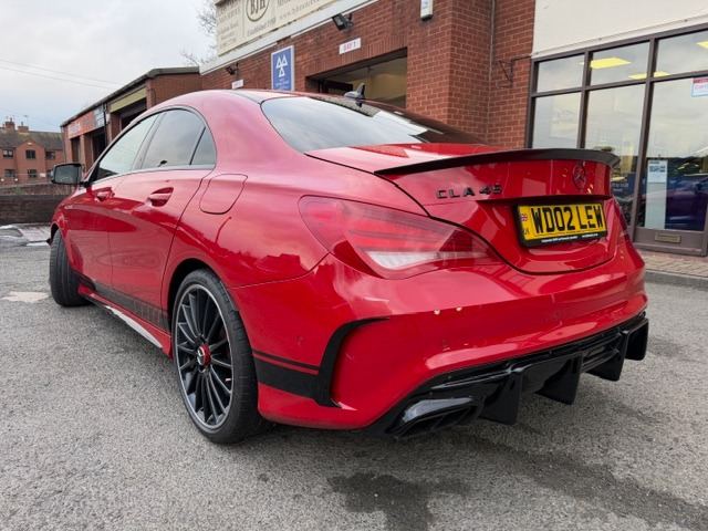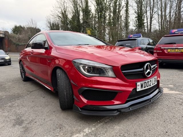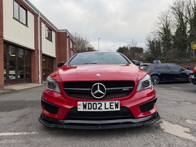 This breath-taking 2014 14-Reg Mercedes CLA 45 AMG 4Matic Auto has to be seen, driven and heard!!!! Presented in special order Jupiter Red with full black/red sports leather seats with red piping, it has covered 94,000 miles with Full Mercedes service history (7 services all Main Dealer and has just been pre-MOT'd with 4 new tyres,new brake discs front and back,front link bars and all other advisories repaired) and comes with what must be every possible extra you could have!!! on top of the standard specification it has £4,500 worth of extras yes £4,500 worth!!! These include Full AMG Aerodynamic Package, AMG Exclusive package, AMG Performance exhaust,19"" AMG Alloy wheels, Full AMG Sports interior, full factory wide screen Command/Sat nav Online with media interface and Bluetooth phone prep, AMG Performance steering wheel in leather, Mercedes Bi-Xenon light system, mirror package, with auto dimming interior mirror, Front and rear parking sensors with reverse camera, heated front windscreen and headlamps wash wipe, Xenon headlamps, cruise control with brake function,, Painted Brake Callipers, digital climate control and AMG Rear spoiler!!! without doubt the best spec, best condition example you will find and being petrol is still fully ULEZ Compliant!!!Price also includes Private Reg No Shown ""WD02 LEW""