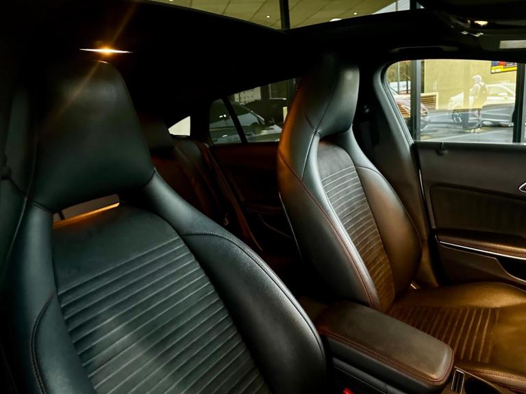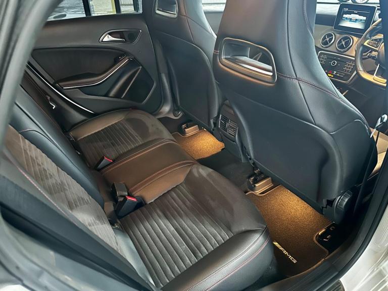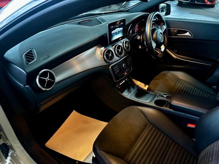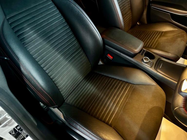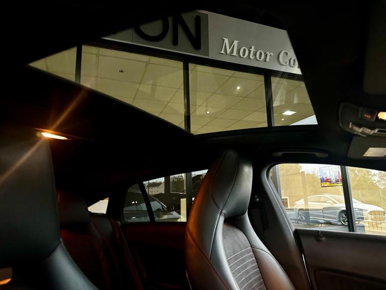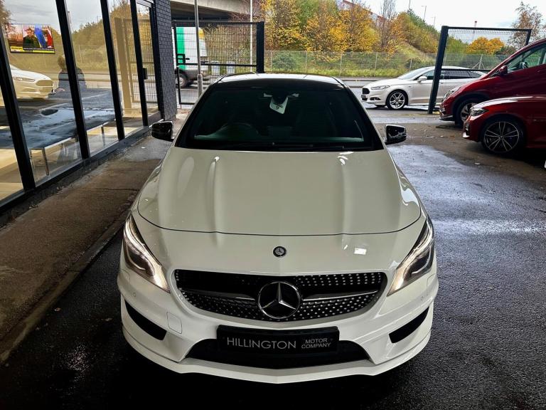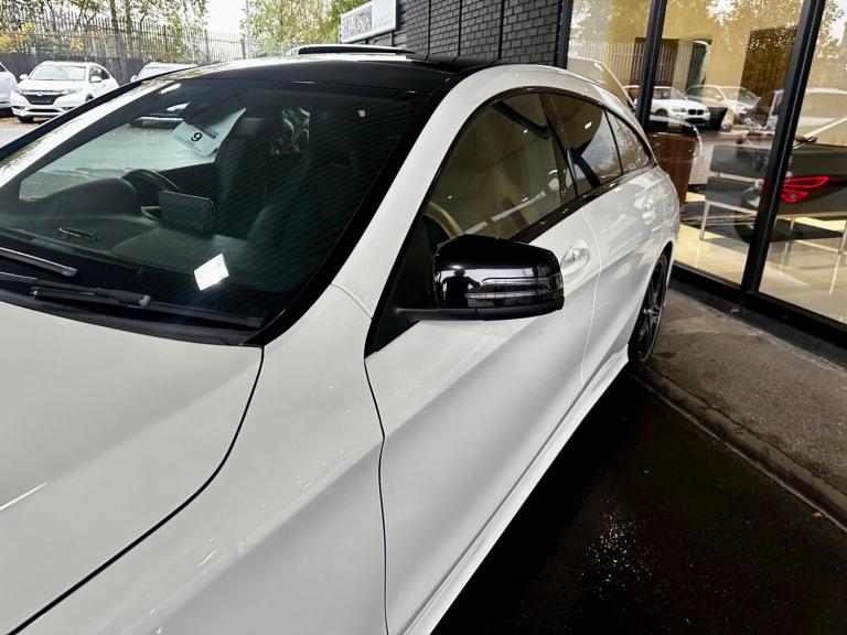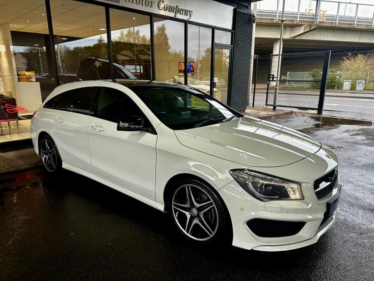 THIS IS A STUNNING EXAMPLE OF A MERCEDES CLA SHOOTING BRAKE HAVING ONE OWNER FROM NEW AND A FULL SERVICE HISTORY LAST CARRIED OUT AT 65277 MILES PREVIOUSLY 57589, 52045, 47293, 34288, 26965, 16435. WHITE WITH BLACK HALF LEATHER AND SUEDE, PANORAMIC SUNROOF, SAT NAV+DAB+BLUETOOTH, LEATHER SPORTS MULTIFUNCTION STEERING WHEEL WITH CRUISE CONTROL, DUAL CLIMATE CONTROL, OBC, FRONT AND REAR PARKING SENSORS, XENONS, AMG SPORTS STYLING, AMG ALLOYS. THIS HAS HAD THE SAME OWNER SINCE IT WAS NEW AND A FULL SERVICE HISTORY