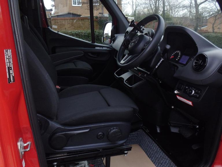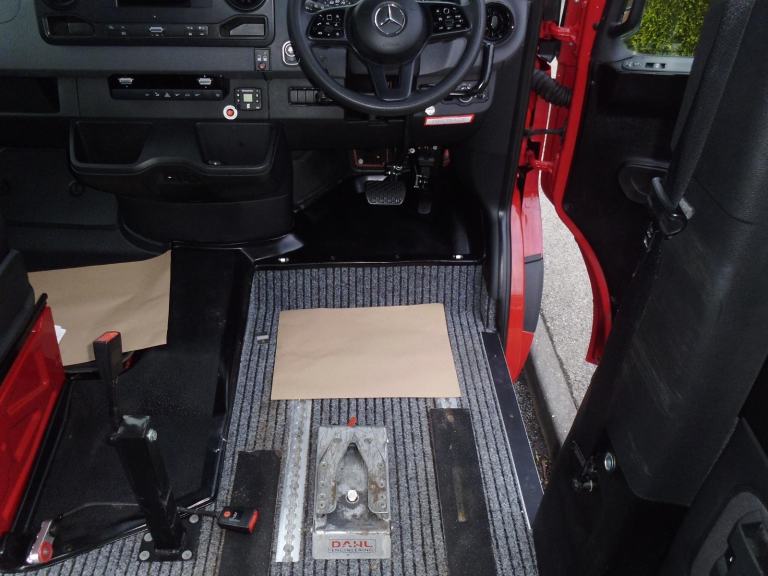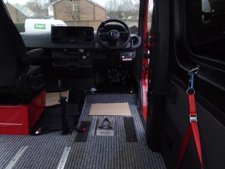 THIS SPRINTER HAS A DRIVE FROM WHEELCHAIR CONVERSION, WITH THE DRIVERS SEAT REMOVED THIS REVEALS A FLOOR MOUNTED WHEELCHAIR LOCK, THIS CAN BE USED TO SECURE A WHEELCHAIR USER IN THE DRIVING POSITION ( THE CORRECT COMPATIBLE FITTING FOR THE LOCK SYSTEM WILL BE REQUIRED TO FIT YOUR WHEELCHAIR ).