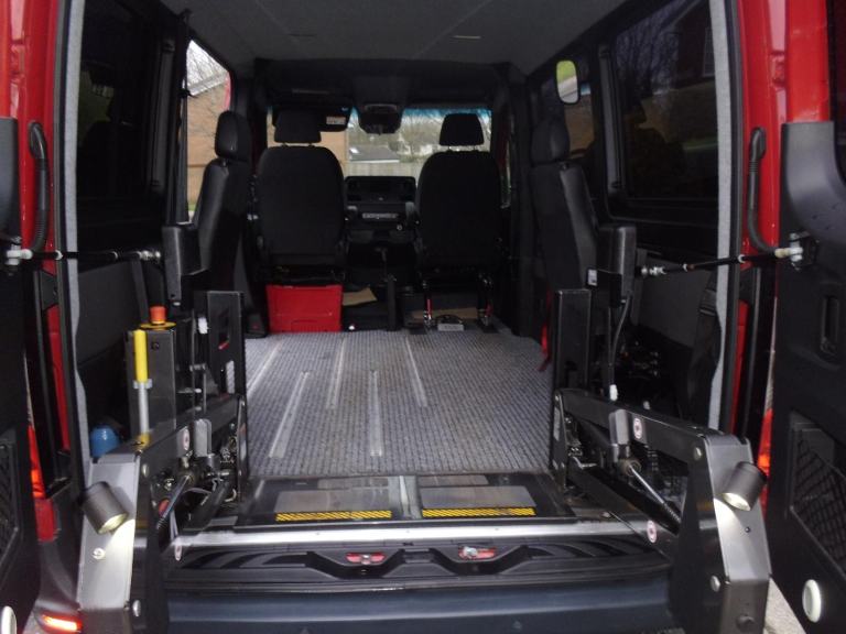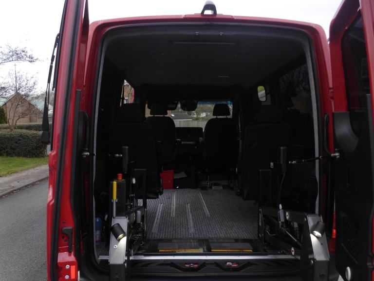 WHEN APPROACHING THE REAR OF THIS SPRINTER THE STANDARD REMOTE KEY UNLOCKS THE DOORS, A SEPARATE REMOTE OPENS THE POWERED REAR DOORS AND DEPLOYS THE WHEELCHAIR LIFT SO THAT A WHEELCHAIR CAN BE DRIVEN ONTO THE LIFT AND LOADED INTO THE VEHICLE, THE REMOTE IS THEN USED FOR STOWING THE LIFT AND CLOSING THE REAR DOORS.
