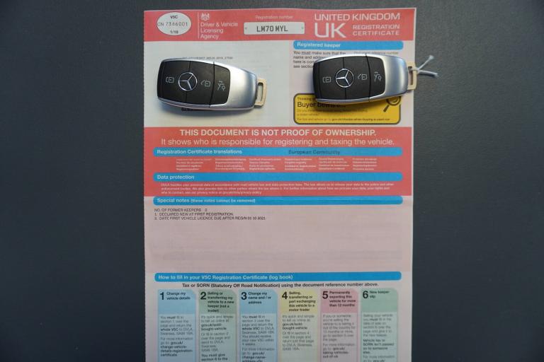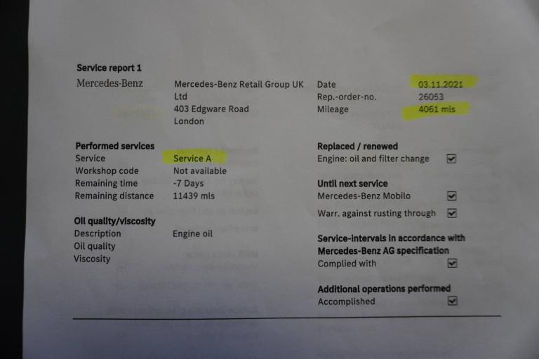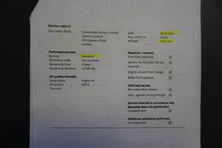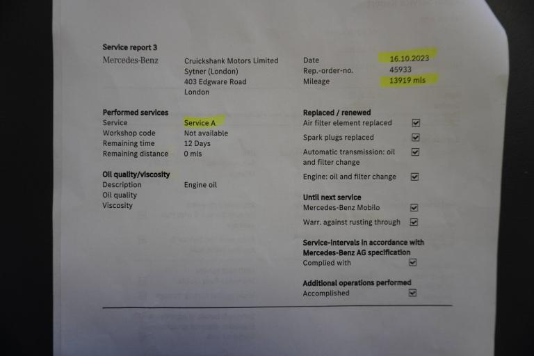 3 rear 3 point seatbelts, ABS with Brake Assist, Active bonnet pedestrain safety measure which detects an impact and raises bonnet by 65mm, Active brake assist includes forward collision warning system with autonomous braking, Adaptive brake assist with hold function and hill start assist, Bonnet with power domes, Brake pad wear warning indicator, Childproof locks manually operated for rear doors and electrically operated for rear power windows, Crash responsive emergency lighting, Driver and passenger head and side airbags, Drivers knee airbag, Dual stage driver/passenger airbags, Electronic parking brake, ESP curve dynamic assist, ESP with ASR, Front and rear seatbelt reminder, Front passenger seat occupancy sensor, Tyre pressure monitoring system, Warning triangle and first aid kit, Window airbags, 180 degree reversing camera with parking guidelines, 7 inch digital instrument cluster display, Active lane keeping assist, Attention assist, Cruise control + speed limiter, DYNAMIC SELECT with a choice of driving modes (ECO, Comfort, Sport and Individual), ECO start/stop function, Fluid level warning indicator for fuel, oil, coolant and washer fluid, Hard-disk navigation, Hey Mercedes Voice activation, Lamp failure indicator, Mercedes me connect including emergency call system, accident recovery, breakdown management and maintenance, Mercedes me remote services, Multi function trip computer, Outside temperature gauge, Owners manual and service booklet in English, Pre-installation of private car share, Radio aerial integrated into front and rear windshields, Service indicator (ASSYST), Speed limit assist, Speed sensitive power steering, Status display for rear seat belts in instrument cluster, Adaptive brake lights, Aerial for GPS, Aluminium roof rails, Automatic headlamp activation, Beltline strips and weather strip in chrome, Black grained claddings with chrome parts, Body colour bumpers, Body colour door handles, Body colour door mirrors, Car wash function, Dark chrome front and rear apron trim, Electric front windows, Electric rear windows, Electrically adjustable and heated door mirrors with integrated LED indicators, Exhaust system with dual flow exhaust pipes (non-functional), Front bumper with underride guard in high gloss chrome, Front door sills with Mercedes-Benz lettering, Heated glass rear windscreen + timer control, Heated windscreen wash system, Interior mirror with black reading lamps and frameless, LED high performance headlamps with