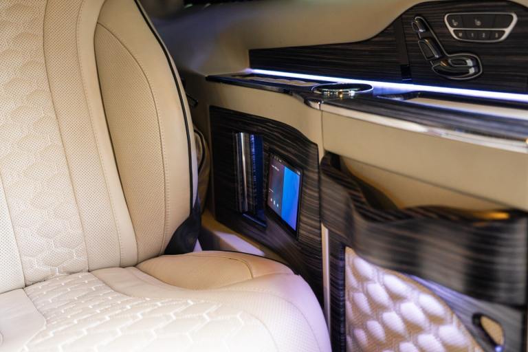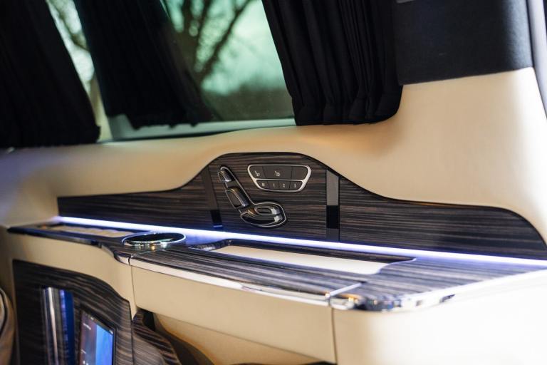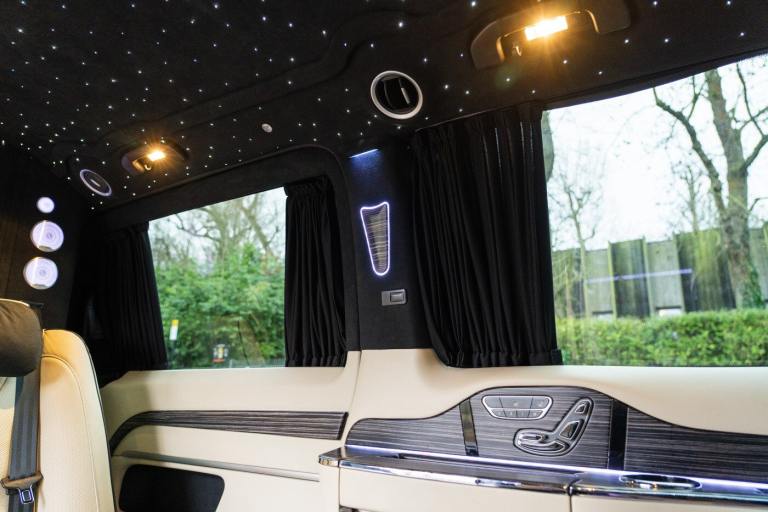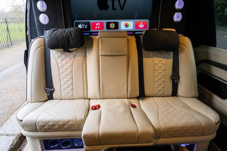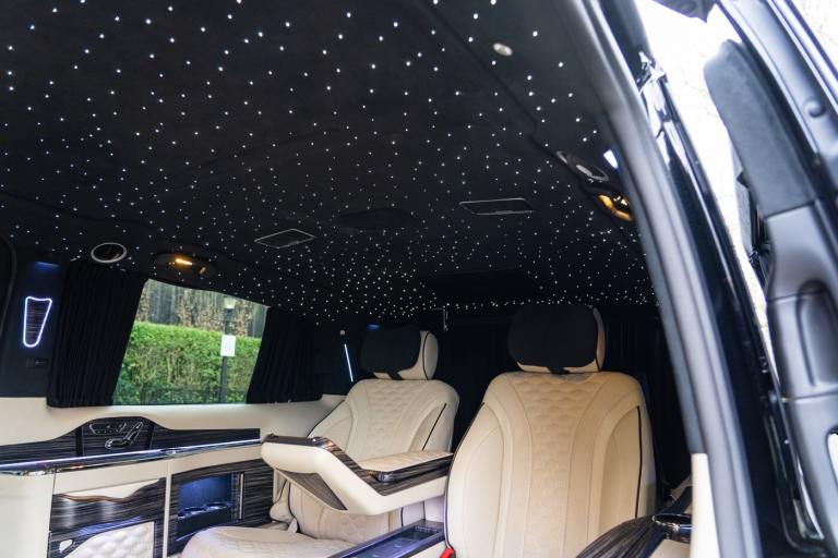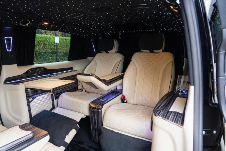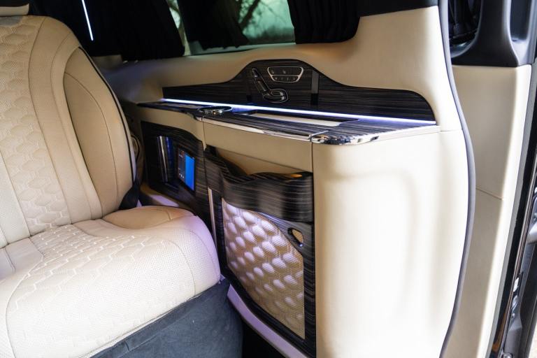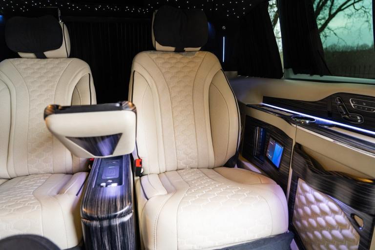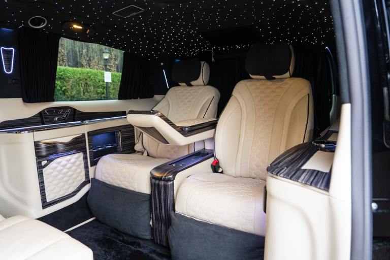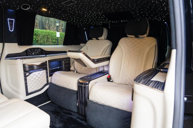 .Clive Sutton has been at the forefront of luxury VIP conversions for Mercedes-Benz-based vans for over 25 years. The Mercedes-Benz VIP Class by Sutton represents the pinnacle of chauffeur-driven luxury, combining exceptional practicality, space, and comfort in a fully customized people carrier. Each VIP Class conversion is tailored to individual requirements, featuring handcrafted interiors, bespoke seating configurations, and cutting-edge entertainment options. Whether configured for corporate use, personal luxury travel, or executive transport, this VIP-Class model delivers an unparalleled passenger experience. The exquisite interior is finished in premium materials such as fine leather, Alcantara, and hand-polished wood veneers. Passengers enjoy electrically adjustable first-class seating with heating, cooling, and massage functions, a state-of-the-art entertainment system with twin 4K screens, Apple TV, and PlayStation, plus a fully integrated soundproofing system ensuring a tranquil journey. Additional enhancements include a built-in fridge, humidors, ambient lighting, and a drivers partition for complete privacy. The 4G connectivity system provides seamless communication and entertainment while on the move. Externally, the VIP Class features a subtle yet commanding presence, finished in Obsidian Black. The design complements the luxurious cabin, making it an ideal choice for business executives, high-profile individuals, and VIP transport services. This example is physical and available from Clive Sutton..VIP Guest Seating: 2x Luxury Mercedes-Benz ML-Class Seats (electrically adjustable), Heated and ventilated seats, Electrically reclining and extending footrest, S-Class seat controls, Electrically driving drawers, Integrated umbrella holder, Humidor cigar box, Twin chrome cup holders, Nespresso coffee machine with storage, RRS remote iPad system, Apple TV, Integrated PlayStation 4, Harman Kardon Cinema Sound System, USB and HDMI connectivity, 4G Internet Modem, Switch Mode, 32 Electrically driving LED HQ screen, Rolls-Royce Starlight headliner, High-quality fur carpet, Exclusive chrome features, Electrically folding VIP tables, Luxury middle console with storage, Leather-trimmed cockpit, Steering wheel with mahogany wood and leather, High-end ambiance lighting, Mahogany wood paneling, Black-out curtains, Two-tone horn, Integrated valet key, Digital radio, Traffic Sign Recognition, Park Assist, Bentley Signature Audio, Blind Spot Assist,